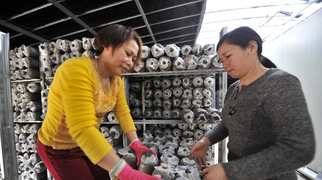 黃鑾英(右)與姐妹們在菇房內(nèi)整理菇包。福州日報記者 鄭帥 攝