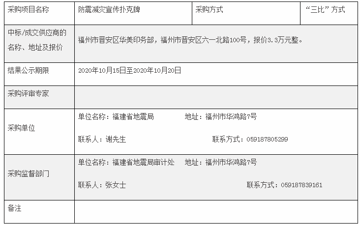 震害防御處防震減災(zāi)宣傳撲克牌“采購結(jié)果公告”