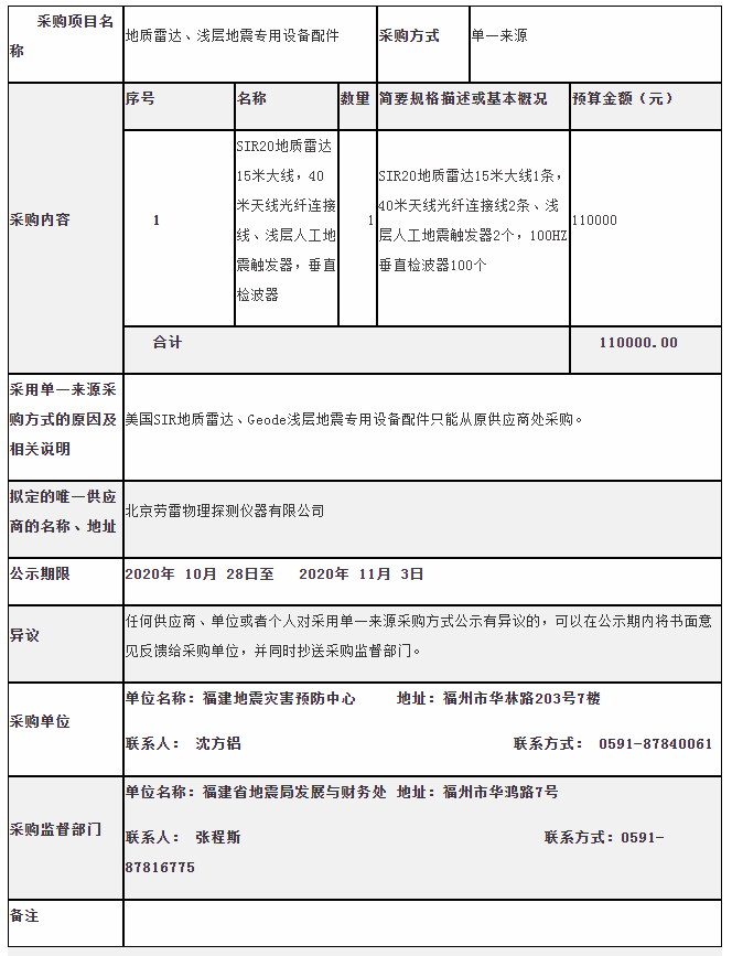 地震災(zāi)害預(yù)防中心“地質(zhì)雷達、淺層地震專用設(shè)備配件”單一來源采購公示