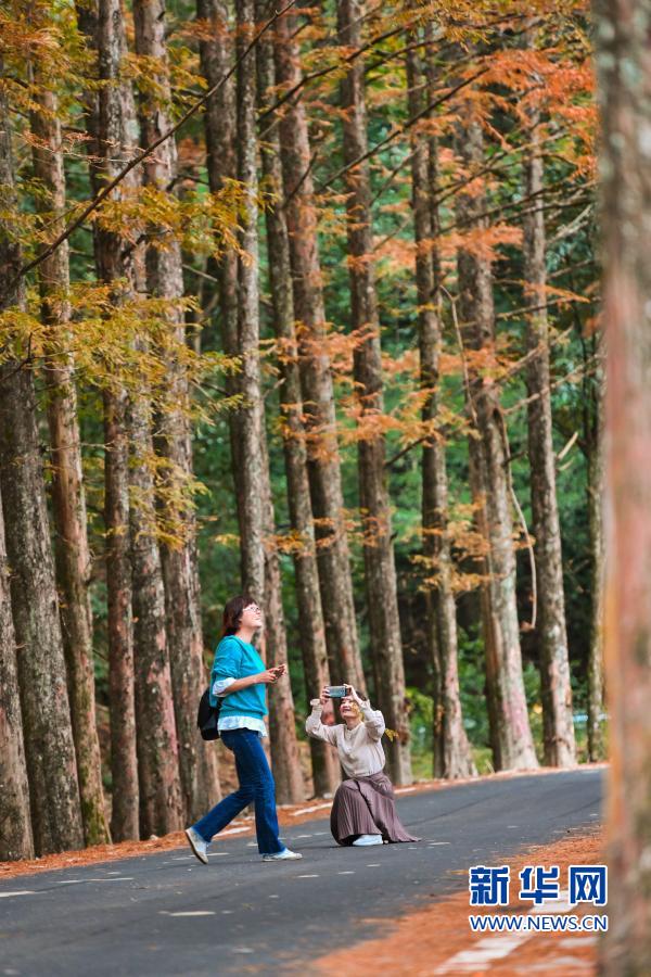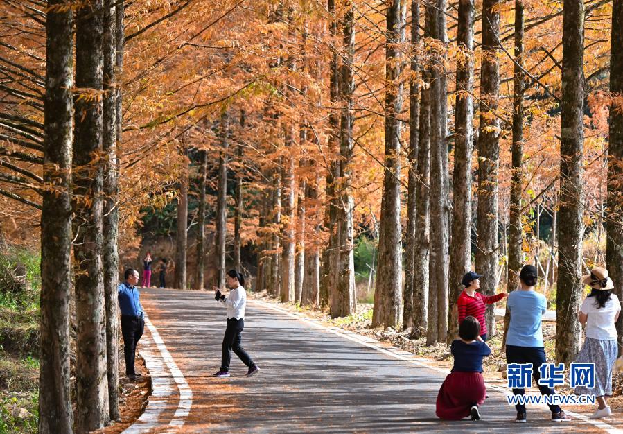 11月19日,游客在福建省三明市將樂縣國家級自然保護區(qū)水杉大道游覽。新華社記者 宋為偉 攝