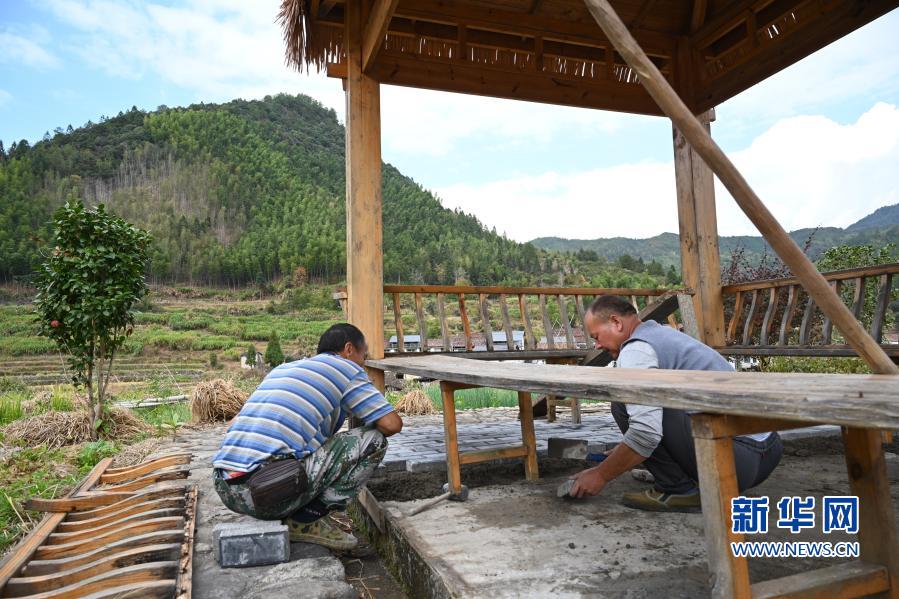 11月19日,嶺下村村民在維修村里的涼亭。新華社記者姜克紅 攝 |