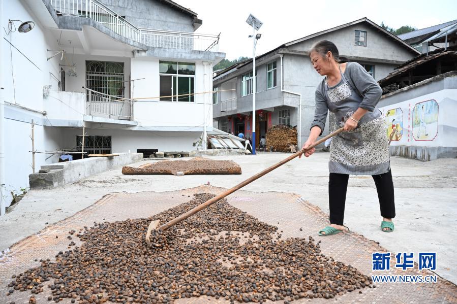 11月19日,嶺下村村民在晾曬油茶籽。油茶種植是嶺下村的主要特色農(nóng)業(yè),鄉(xiāng)村旅游帶動(dòng)了油茶的銷售,助力村民增收。新華社記者姜克紅 攝