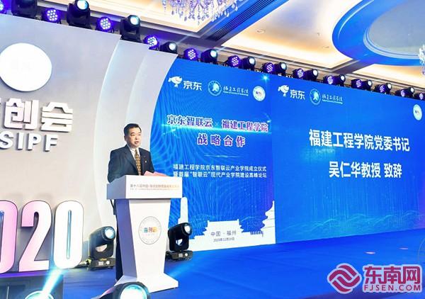 吳仁華致辭。東南網(wǎng)記者 陳楠 攝 東南網(wǎng)12月10日訊(本網(wǎng)記者 陳楠)今天上午,作為第十八屆“海創(chuàng)會”配套活動的福建工程學院京東智聯(lián)云產(chǎn)業(yè)學院成立儀式暨首屆“智聯(lián)云”現(xiàn)代產(chǎn)業(yè)學院建設高峰論壇在福州市開幕。 記者在會上獲悉,此次雙方聯(lián)合成立的福建工程學院京東智聯(lián)云產(chǎn)業(yè)學院將致力于開展產(chǎn)教融合創(chuàng)新示范,在電商、貿(mào)易、物流供應鏈、人工智能等領域建立長效穩(wěn)固的合作機制,加快福建省該領域應用型人才培養(yǎng)。學院依托于互聯(lián)網(wǎng)經(jīng)貿(mào)學院,開設電子商務行業(yè)工程師實驗班,并整合線下線上教學資源等多種教學模式。目前學院現(xiàn)有富民云咖新媒體產(chǎn)教融合基地、互聯(lián)網(wǎng)創(chuàng)客中心等校內(nèi)實踐平臺,以及可利用的京東(福清)電商產(chǎn)業(yè)園、京東(仙游)數(shù)字經(jīng)濟產(chǎn)業(yè)園、京東(廈門)電子商務產(chǎn)業(yè)園等多個省內(nèi)實踐平臺,引入產(chǎn)業(yè)知識與技能入課堂,打造理論與實踐無縫對接的學習模式。
