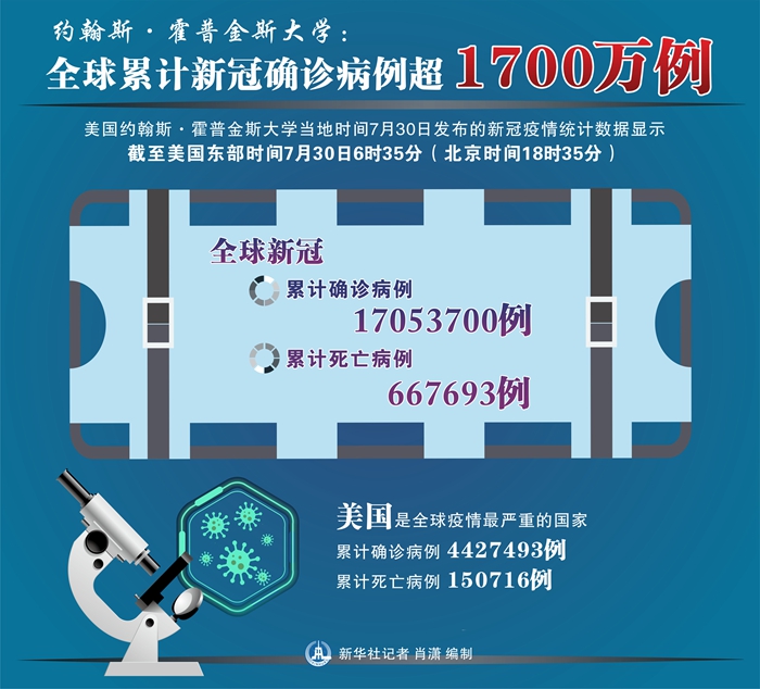 約翰斯·霍普金斯大學:全球累計新冠病例超1700萬例