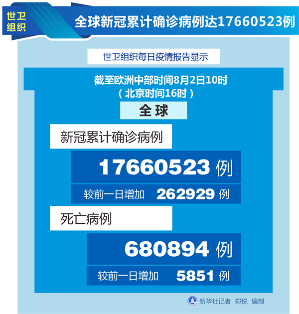 世衛(wèi)組織每日疫情報告顯示,截至歐洲中部時間2日10時(北京時間16時),全球確診病例較前一日增加262929例,達到17660523例;死亡病例增加5851例,達到680894例。