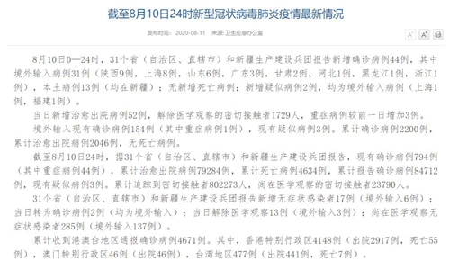 國家衛(wèi)健委:8月10日新增確診病例44例 其中本土病例13例