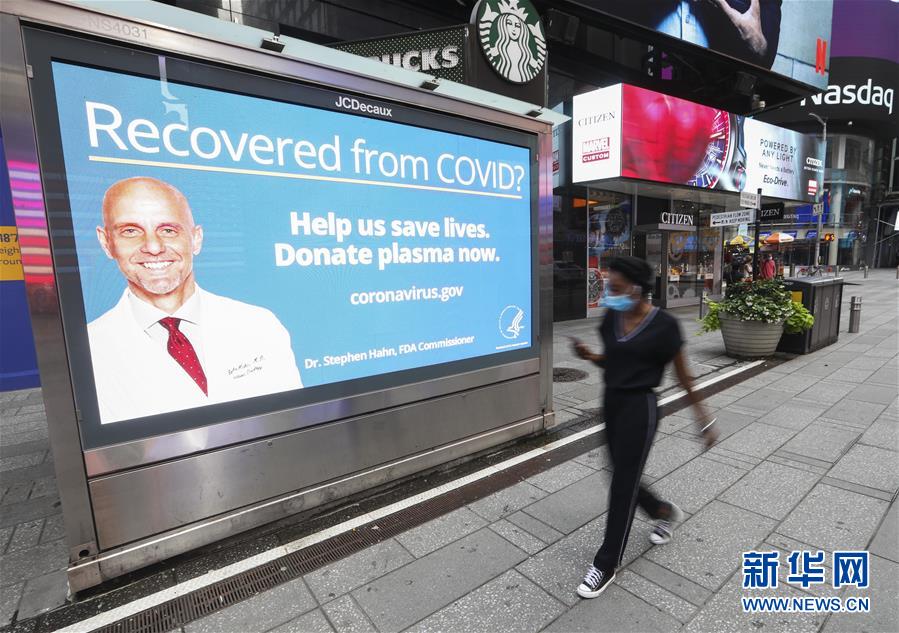 8月19日,在美國紐約,一名行人從號召新冠康復者捐獻血漿的廣告牌旁走過。 新華社記者 王迎 攝