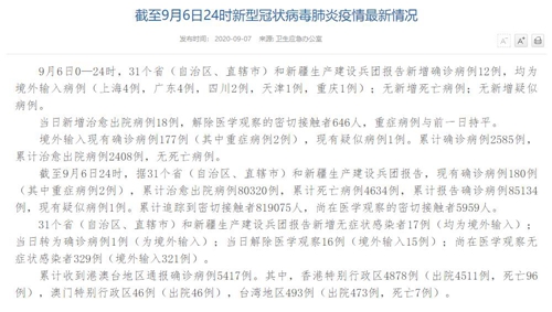 國(guó)家衛(wèi)健委:9月6日新增確診病例12例 均為境外輸入病例