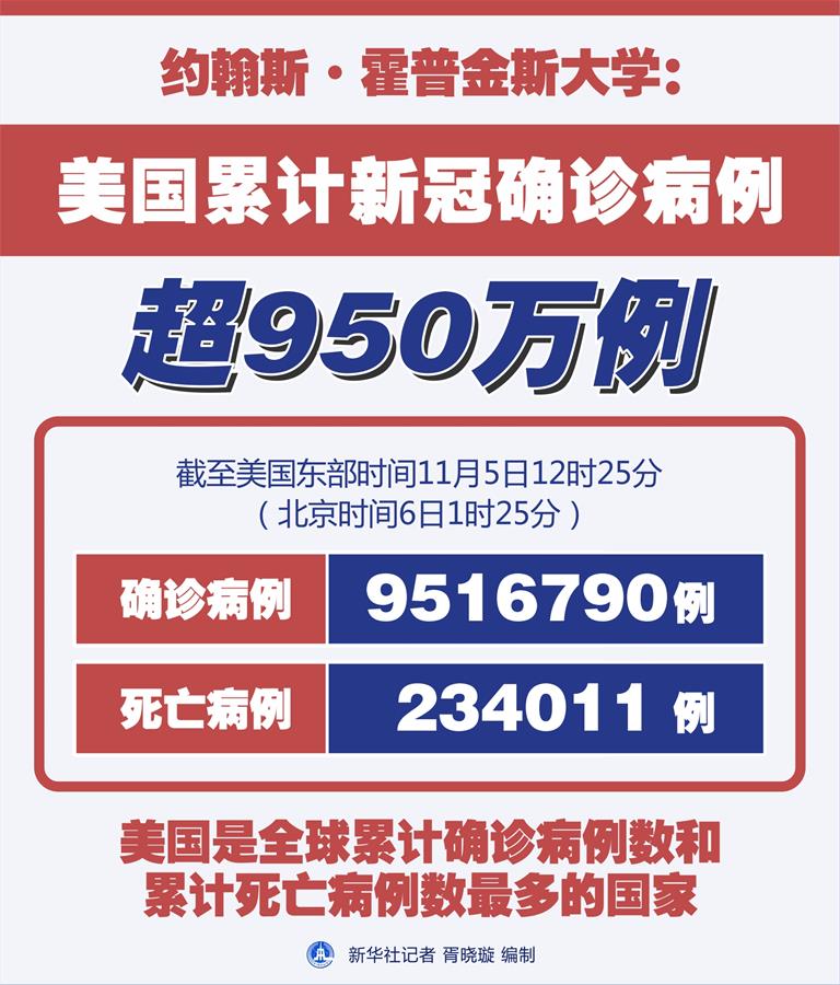 約翰斯·霍普金斯大學(xué):美國累計(jì)新冠確診病例超950萬例