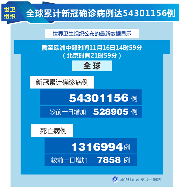 新華社日內(nèi)瓦11月16日電(記者劉曲)世界衛(wèi)生組織16日公布的最新數(shù)據(jù)顯示,全球累計新冠確診病例達(dá)54301156例。 世衛(wèi)組織網(wǎng)站最新數(shù)據(jù)顯示,截至歐洲中部時間16日14時59分(北京時間21時59分),全球確診病例較前一日增加528905例,達(dá)到54301156例;死亡病例增加7858例,達(dá)到1316994例。