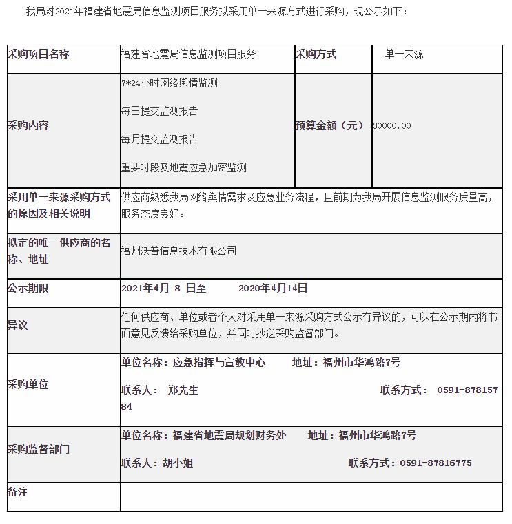 應(yīng)急指揮與宣教中心福建省地震局信息監(jiān)測項目服務(wù)采購公示