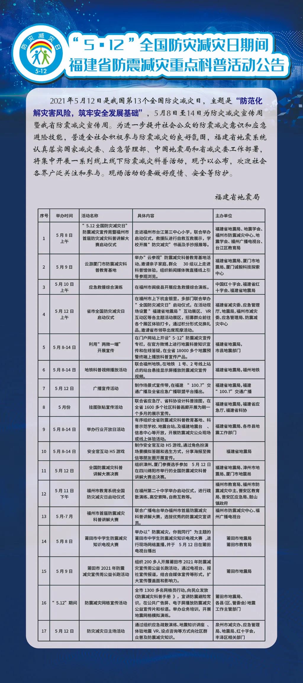 “5?12”全國(guó)防災(zāi)減災(zāi)日期間福建省防震減災(zāi)重點(diǎn)科普活動(dòng)公告