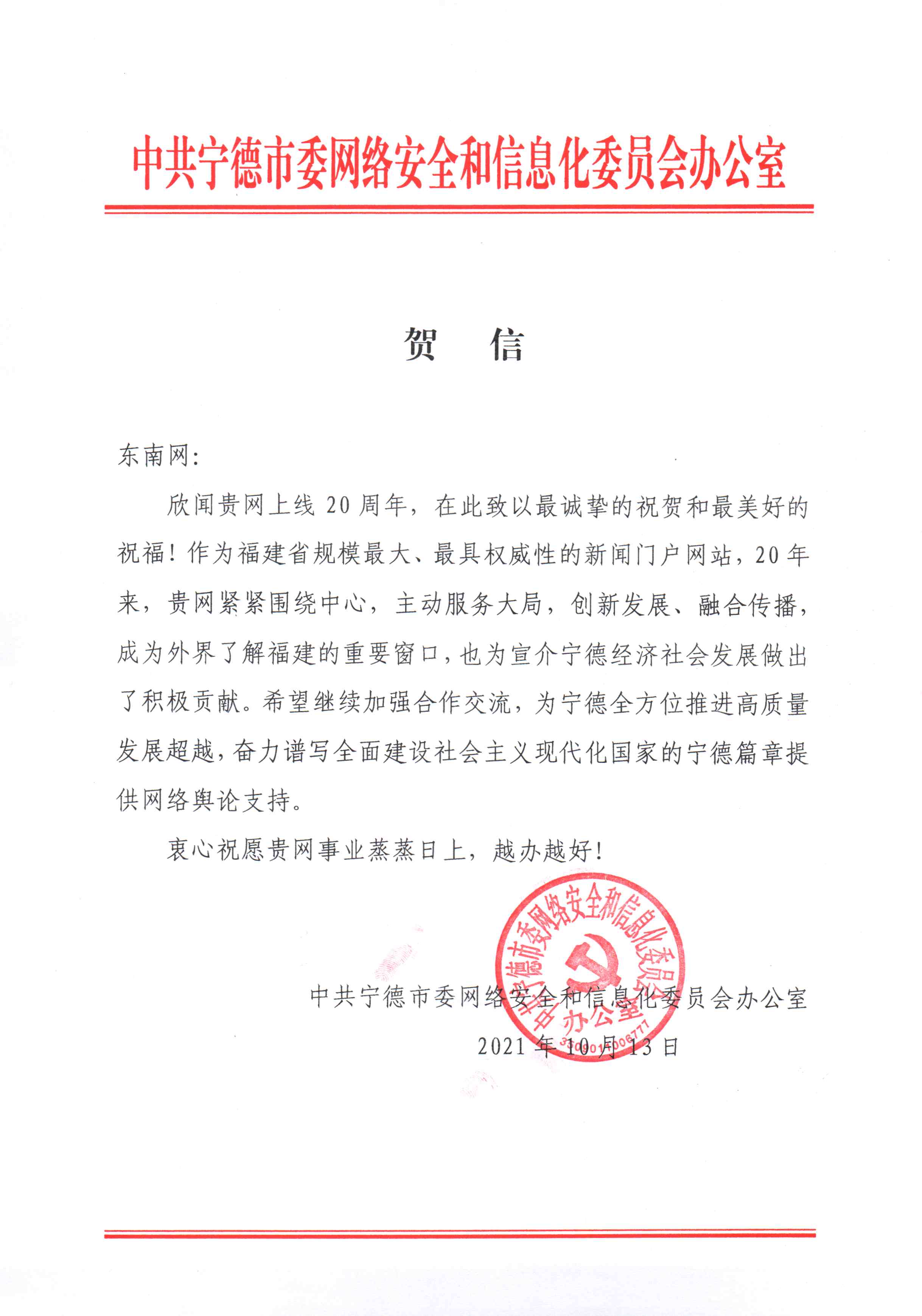 中共寧德市委網(wǎng)絡(luò)安全和信息化委員會辦公室賀信