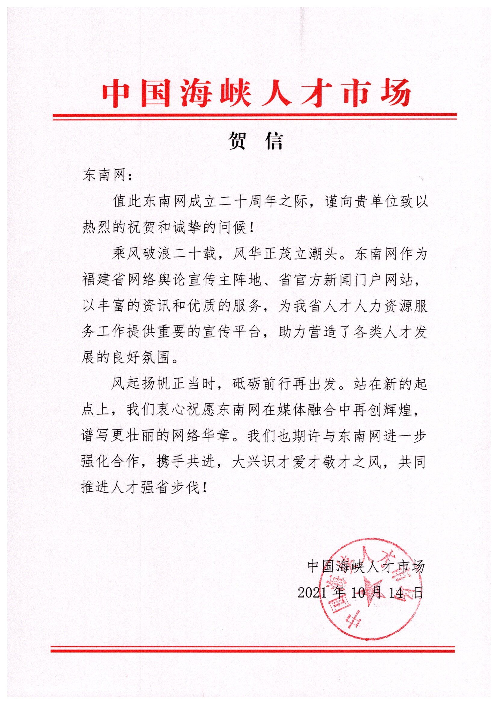 中國海峽人才市場(chǎng)賀信
