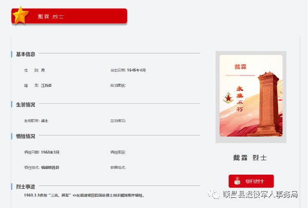 戴霖烈士生前是6703部隊戰(zhàn)士 負責原順昌二中(現(xiàn)埔上中學) 三年(2)班的軍訓 今年2月8日,順昌縣退役軍人事務局接到江蘇省泰州市海陵區(qū)退役軍人事務局來電,請求幫助查找戴霖烈士墓,并提供了1968年4月18日和1969年4月5日祭掃烈士墓的照片,順昌縣退役軍人事務局立即根據照片背面的文字,在縣教育局的協(xié)助下,了解當年的有關情況以及尋找知情人員。期間,順昌縣退役軍人事務局還聯(lián)系了元坑鎮(zhèn)、埔上鎮(zhèn)等單位幫助查找核對烈士墓的線索。 80多歲高齡的陳新民老師見證了當年戴霖烈士排彈犧牲的過程,2月24日,他帶領順昌縣退役軍人事務局到雙溪街道余墩采育場附近尋找烈士墓,由于年代久遠,烈士墓被茅草、小莖竹等遮掩,當日未能找到。 2月25日,順昌縣退役軍人事務局利用微信公眾號向社會發(fā)布消息征集線索。 2月25日下午,在熱心同志的幫助下,順昌縣退役軍人事務局再次組織人員到余墩采育場附近搜尋烈士墓。經過對近兩公里范圍的仔細搜尋和反復確認方位,終于發(fā)現(xiàn)了烈士墓。經辯別碑文并比對當年的祭掃照片,以及陳新民老師到場識別,確認此墓為戴霖烈士墓。 2月28日,順昌縣退役軍人事務局組織人員對戴霖烈士墓周圍進行了清理,工作人員向烈士敬獻了花束,等待烈士家屬前來尋親,并與泰州市海陵區(qū)退役軍人事務局聯(lián)系,商討下一步的保護工作。