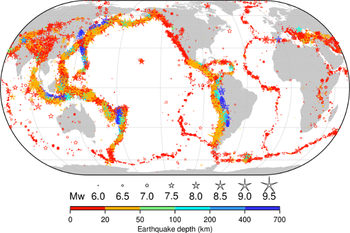 國(guó)際地震中心2020年4月發(fā)布的1904-2016年全球Mw6.0地震分布圖 自1907年有關(guān)發(fā)現(xiàn)深源地震的觀測(cè)結(jié)果發(fā)表后,就受到廣泛質(zhì)疑,直至和達(dá)清夫通過(guò)研究證實(shí)了深源地震的存在,以及貝尼奧夫綜合地質(zhì)、地震和物理信息提出貝尼奧夫帶(現(xiàn)稱(chēng)Wadati-Benioff帶,即俯沖帶)來(lái)解釋深震活動(dòng)圖像,深震作為一種“不可思議”的現(xiàn)象始得到較廣泛研究。近百年的觀測(cè)研究表明:天然發(fā)生的深震與淺震都屬于構(gòu)造地震,是人類(lèi)生存的地球深部鮮活運(yùn)轉(zhuǎn)著的體現(xiàn)。