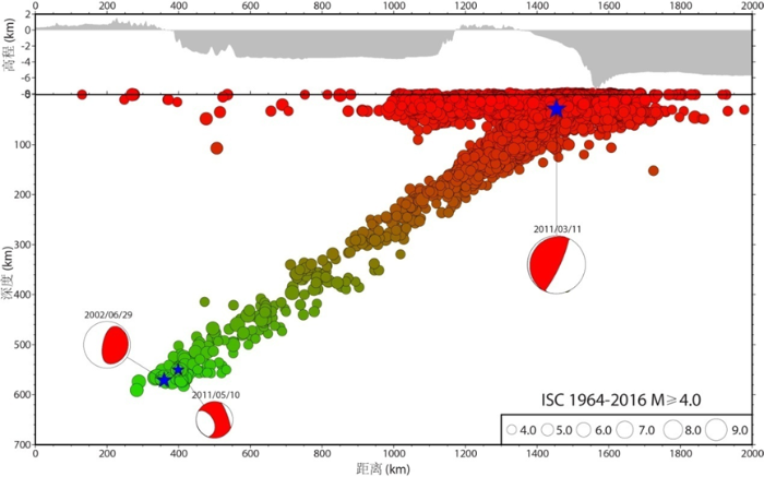 日本海溝至中國(guó)東北的剖面兩側(cè)300 km范圍內(nèi)的地震深度分布藍(lán)圖 圖中藍(lán)色星號(hào)處及其連線分別給出2002年6月29日汪清7.2級(jí)深震、2011年5月10日中國(guó)東北中俄邊界處6.1級(jí)深震和2011年3月11日日本東北9.0級(jí)淺震的位置和震源機(jī)制解; 圖上方畫(huà)出了剖面沿線的陸地和海洋地形形態(tài) 二、深震與淺震的似與不似 迄今為止,人類(lèi)記錄到的最大深源地震是2013年5月24日鄂霍茨克海8.3級(jí)地震(深度約607 km)和1994年6月9日玻利維亞8.3級(jí)(也有報(bào)告說(shuō)為8.2級(jí))地震(深度約637 km)。人類(lèi)記錄到的最深的大地震是2015年5月30日發(fā)生在日本小笠原群島的7.9級(jí)深震(日本氣象廳測(cè)定8.1級(jí)),國(guó)際地震中心最終確定的震源深度為685.5 km。