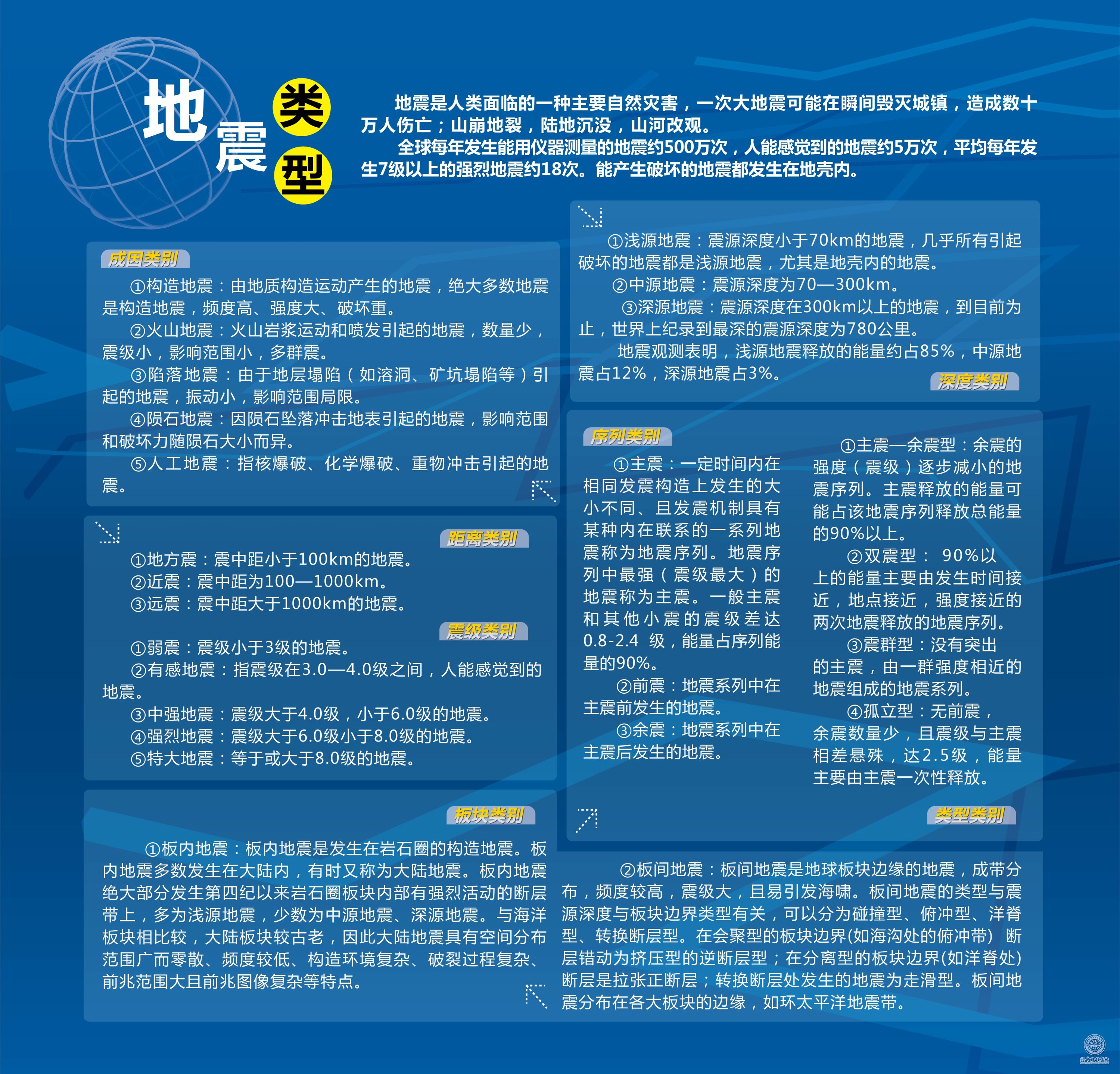 地震是人類面臨的一種主要自然災(zāi)害,一次大地震可能在瞬間毀滅城鎮(zhèn),造成數(shù)十萬人傷亡;山崩地裂,陸地沉沒,山河改觀。 全球每年發(fā)生能用儀器測量的地震約500萬次,人能感覺到的地震約5萬次,平均每年發(fā)生7級(jí)以上的強(qiáng)烈地震約18次。能產(chǎn)生破壞的地震都發(fā)生在地殼內(nèi)。 成因類別 ①構(gòu)造地震:由地質(zhì)構(gòu)造運(yùn)動(dòng)產(chǎn)生的地震,絕大多數(shù)地震是構(gòu)造地震,頻度高、強(qiáng)度大、破壞重。 ②火山地震:火山巖漿運(yùn)動(dòng)和噴發(fā)引起的地震,數(shù)量少,震級(jí)小,影響范圍小,多群震。 ③陷落地震:由于地層塌陷(如溶洞、礦坑塌陷等)引起的地震,振動(dòng)小,影響范圍局限。 ④隕石地震:因隕石墜落沖擊地表引起的地震,影響范圍和破壞力隨隕石大小而異。 ⑤人工地震:指核爆破、化學(xué)爆破、重物沖擊引起的地震。 深度類別 ①淺源地震:震源深度小于70km的地震,幾乎所有引起破壞的地震都是淺源地震,尤其是地殼內(nèi)的地震。 ②中源地震:震源深度為70—300km。 ③深源地震:震源深度在300km以上的地震,到目前為止,世界上紀(jì)錄到最深的震源深度為780公里。 地震觀測表明,淺源地震釋放的能量約占85%,中源地震占12%,深源地震占3%。 距離類別 ①地方震:震中距小于100km的地震。 ②近震:震中距為100—1000km。 ③遠(yuǎn)震:震中距大于1000km的地震。 震級(jí)類別 ①弱震:震級(jí)小于3級(jí)的地震。 ②有感地震:指震級(jí)在3.0—4.0級(jí)之間,人能感覺到的地震。 ③中強(qiáng)地震:震級(jí)大于4.0級(jí),小于6.0級(jí)的地震。 ④強(qiáng)烈地震:震級(jí)大于6.0級(jí)小于8.0級(jí)的地震。 ⑤特大地震:等于或大于8.0級(jí)的地震。 序列類別 ①主震:一定時(shí)間內(nèi)在相同發(fā)震構(gòu)造上發(fā)生的大小不同、且發(fā)震機(jī)制具有某種內(nèi)在聯(lián)系的一系列地震稱為地震序列。地震序列中最強(qiáng)(震級(jí)最大)的地震稱為主震。一般主震和其他小震的震級(jí)差達(dá)0.8-2.4 級(jí),能量占序列能量的90%。 ②前震:地震系列中在主震前發(fā)生的地震。 ③余震:地震系列中在主震后發(fā)生的地震。 類型類別 ①主震—余震型:余震的強(qiáng)度(震級(jí))逐步減小的地震序列。主震釋放的能量可能占該地震序列釋放總能量的90%以上。 ②雙震型:90%以上的能量主要由發(fā)生時(shí)間接近,地點(diǎn)接近,強(qiáng)度接近的兩次地震釋放的地震序列。 ③震群型:沒有突出的主震,由一群強(qiáng)度相近的地震組成的地震系列。 ④孤立型:無前震,余震數(shù)量少,且震級(jí)與主震相差懸殊,達(dá)2.5級(jí),能量主要由主震一次性釋放。 板塊類別 ①板內(nèi)地震:板內(nèi)地震是發(fā)生在巖石圈的構(gòu)造地震。板內(nèi)地震多數(shù)發(fā)生在大陸內(nèi),有時(shí)又稱為大陸地震。板內(nèi)地震絕大部分發(fā)生第四紀(jì)以來巖石圈板塊內(nèi)部有強(qiáng)烈活動(dòng)的斷層帶上,多為淺源地震,少數(shù)為中源地震、深源地震。與海洋板塊相比較,大陸板塊較古老,因此大陸地震具有空間分布范圍廣而零散、頻度較低、構(gòu)造環(huán)境復(fù)雜、破裂過程復(fù)雜、前兆范圍大且前兆圖像復(fù)雜等特點(diǎn)。 ②板間地震:板間地震是地球板塊邊緣的地震,成帶分布,頻度較高,震級(jí)大,且易引發(fā)海嘯。板間地震的類型與震源深度與板塊邊界類型有關(guān),可以分為碰撞型、俯沖型、洋脊型、轉(zhuǎn)換斷層型。在會(huì)聚型的板塊邊界(如海溝處的俯沖帶) 斷層錯(cuò)動(dòng)為擠壓型的逆斷層型;在分離型的板塊邊界(如洋脊處) 斷層是拉張正斷層;轉(zhuǎn)換斷層處發(fā)生的地震為走滑型。板間地震分布在各大板塊的邊緣,如環(huán)太平洋地震帶。 |