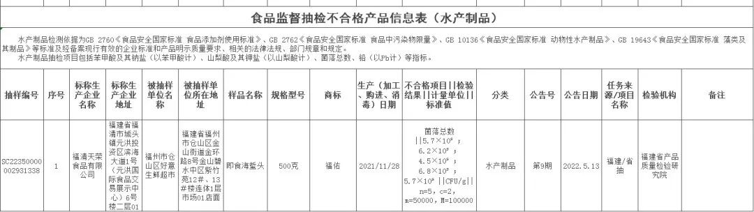 食用油、調味品、糕點…… 食品抽檢結果出爐 本次食品抽檢涉及16大類食品 一起來看看結果如何吧 第九期公告的監(jiān)督抽檢信息涉及16大類食品868批次,包括:糧食加工品、食用油(含油脂及其制品)、調味品、肉制品、乳制品、飲料、速凍食品、酒類、蔬菜制品、水果制品、炒貨食品及堅果制品、水產制品、糕點、豆制品、餐飲食品(含餐飲具)、食用農產品。合格845批次,不合格23批次。涉及微生物污染問題、重金屬污染問題、農獸藥殘留問題、質量指標問題等。 微生物污染問題 廈門旨鮮釋放餐飲服務有限公司的飯碗(消毒日期為2021年11月20日),大腸菌群不合格,檢驗機構為廈門泓益檢測有限公司; 廈門旨鮮釋放餐飲服務有限公司的醬料碟(消毒日期為2021年11月20日),大腸菌群不合格,檢驗機構為廈門泓益檢測有限公司; 臺江區(qū)盛天地餐飲店的小碗(消毒日期為2021年11月20日),大腸菌群不合格,檢驗機構為福建賽福食品檢測研究所有限公司; 臺江區(qū)半天妖餐館的勺子(消毒日期為2021年11月22日),大腸菌群不合格,檢驗機構為福建賽福食品檢測研究所有限公司; 福州市馬尾區(qū)小天餐廳的湯匙(消毒日期為2021年11月24日),大腸菌群不合格,檢驗機構為福建賽福食品檢測研究所有限公司; 福州市倉山區(qū)五翊餐飲管理有限公司的小碗(消毒日期為2021年11月29日),大腸菌群不合格,檢驗機構為福建賽福食品檢測研究所有限公司; 廈門悅港軒餐飲有限公司漳州分公司的筷子(消毒日期為2021年12月6日),大腸菌群不合格,檢驗機構為廈門中集信檢測技術有限公司; 廈門悅港軒餐飲有限公司漳州分公司的碟(消毒日期為2021年12月6日),大腸菌群不合格,檢驗機構為廈門中集信檢測技術有限公司; 福清天榮食品有限公司2021年11月28日生產的即食海蜇頭,菌落總數不合格,銷售單位為福州市倉山區(qū)好意生鮮超市,檢驗機構為福建省產品質量檢驗研究院。