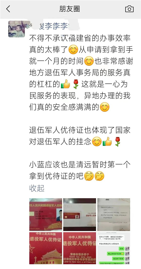 ▲小藍妻子小李發(fā)的朋友圈 自優(yōu)待證辦理工作啟動以來,武平縣退役軍人服務(wù)中心抽調(diào)兩名退役軍人、黨員專門負責(zé),在網(wǎng)絡(luò)技術(shù)支撐、業(yè)務(wù)辦理培訓(xùn)、電子檔案分類、辦公設(shè)備配備、專業(yè)人員選配、辦理進度跟蹤等方面進行了合理調(diào)度和精準選配。截至目前,武平縣優(yōu)待證辦理進入正常操作階段,全縣17個鄉(xiāng)鎮(zhèn)和縣退役軍人服務(wù)中心均可為全縣退役軍人提供優(yōu)質(zhì)、快捷的服務(wù)。同時與三家銀行、縣醫(yī)院、中國石油武平公司、梁野山景區(qū)、教育基地等多家單位和企業(yè)簽訂優(yōu)待服務(wù)協(xié)議,讓更多的退役軍人持優(yōu)待證能夠享受到更好的服務(wù)和更優(yōu)惠的活動,不斷提升榮譽感和幸福感。 |