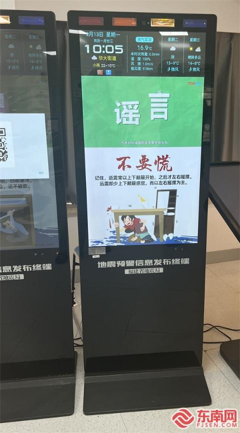 地震預(yù)警信息發(fā)布終端。東南網(wǎng)記者 周霞 攝 就地避險最重要 謹(jǐn)防二次傷害 地震發(fā)生持續(xù)時間往往較短,因此避險必須及時果斷、因地制宜。最佳避險方法是遠(yuǎn)離建筑物,逃生至空曠開闊的廣場、公園等場所,俯身保護(hù)頭部。“如果沒來得及跑,一定要保持穩(wěn)定的情緒,觀察周邊情形,藏身到堅硬牢固的區(qū)域,比如桌下、床下,立刻蹲下并用手或枕頭遮擋頭部,以防傷害?!崩钴娞崾?,在地震波結(jié)束后,要立即觀察周邊環(huán)境,在確保安全的情況下立即逃生,盡量不要返回室內(nèi)。 如不幸被掩埋在地震廢墟中,應(yīng)保存體力,勿大聲喊叫,可以利用敲擊制造響聲來引起救援人員的注意?!坝袟l件時,要盡量加固或擴(kuò)展自己被困的區(qū)域,以防余震對自己造成二次傷害。”李軍建議。