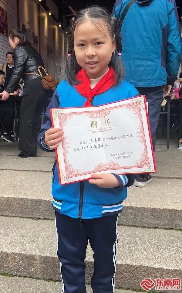 座談會現(xiàn)場,研究會為施程小學(xué)三年級學(xué)生朱墨臻頒發(fā)紅色文化傳承人聘書。 朱墨臻是新四軍駐福州辦事處舊址最小的講解員。她的太姥爺曾是一名新四軍,在她七八歲的時候,奶奶就會和她說太姥爺參與革命和國家建設(shè)的故事,讓她萌發(fā)了對紅色文化的興趣。去年,朱墨臻在參觀新四軍駐福州辦事處舊址時,受邀成為志愿講解員的一員。 據(jù)了解,新四軍駐福州辦事處舊址還將在5月舉辦“長征中的福建子弟兵”展覽,推動黨史學(xué)習(xí)教育常態(tài)化、長效化。 |