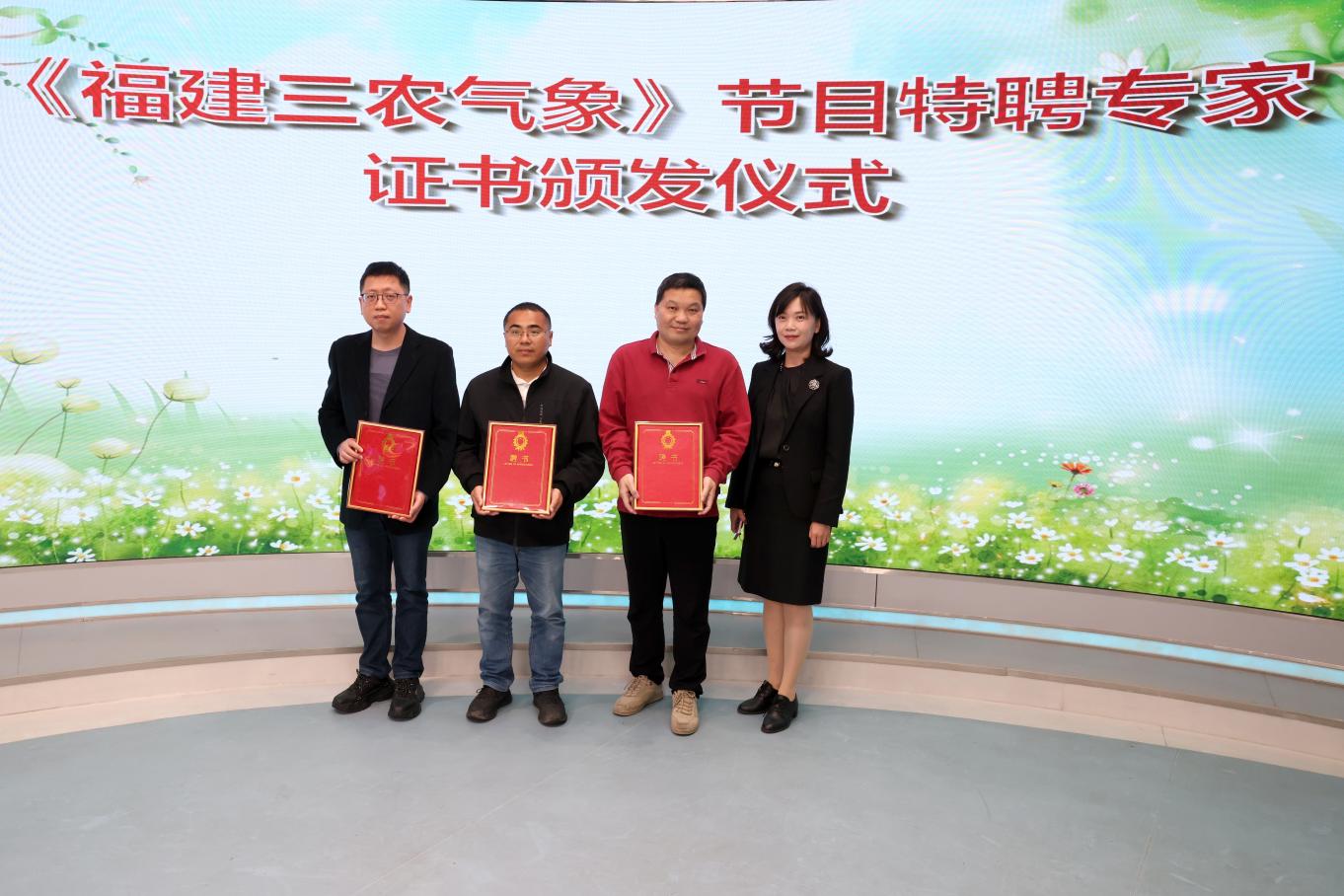 現(xiàn)場,福建省委網(wǎng)信辦副主任劉建斌,福建省農(nóng)業(yè)農(nóng)村廳二級巡視員姚文輝,致公黨福建省委會專職副主委、福建省政協(xié)常務(wù)委員、副秘書長吳棉國,福建省氣象局黨組成員、副局長馮玲等領(lǐng)導(dǎo)共同為“福建三農(nóng)氣象欄目組”揭牌,并向福建省氣象科學(xué)研究所正研級高工楊凱,福州市氣象局農(nóng)試站站長、高級工程師蘇榮瑞,福州市海洋與漁業(yè)技術(shù)中心高級工程師吳品煌3位農(nóng)業(yè)領(lǐng)域特聘專家頒發(fā)聘書。