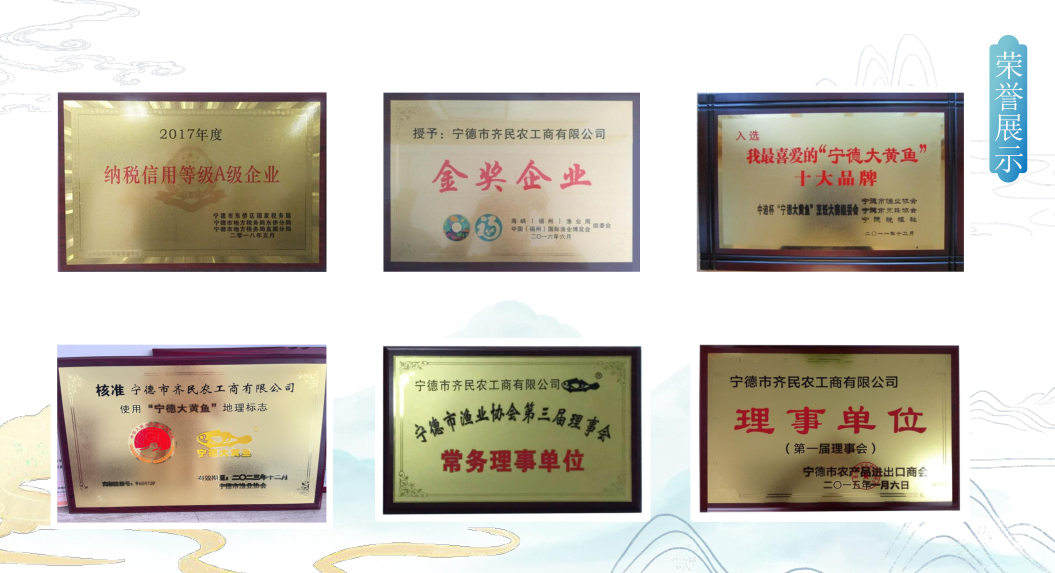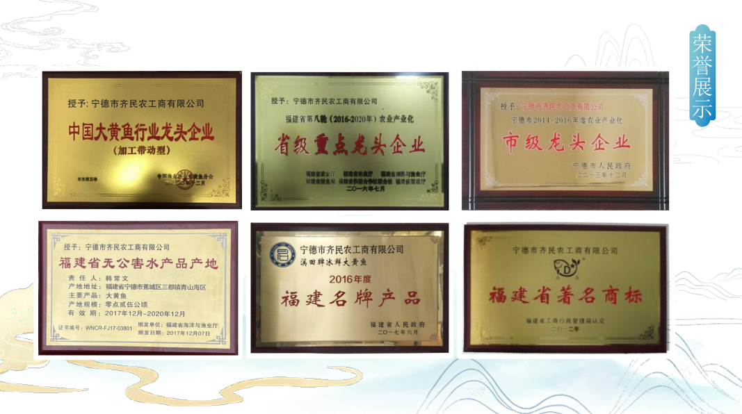 寧德市齊民農(nóng)工商有限公司成立于2006年,是一家以水產(chǎn)品加工為主,育苗、養(yǎng)殖及科研于一體的綜合性省級重點(diǎn)龍頭企業(yè)。公司注冊資本1000萬元,現(xiàn)擁有冷凍加工廠、新型塑膠大黃魚養(yǎng)殖基地、育苗場、漁排等多個(gè)固定資產(chǎn)。公司配備育苗、養(yǎng)殖、加工、科研、進(jìn)出口五大管理部門,在職人員95人。公司生產(chǎn)車間、冷庫均按國際食品法典委員會(CAC)、美國(FDA)等國際標(biāo)準(zhǔn)建造。設(shè)備先進(jìn)、配套齊全,有一條冰鮮產(chǎn)品生產(chǎn)線,兩條冷凍品生產(chǎn)線,一條鹽漬產(chǎn)品生產(chǎn)線和一條干制產(chǎn)品生產(chǎn)線,還有速凍間、冷風(fēng)干燥間、金屬探測儀及化驗(yàn)室等。 公司自2006年創(chuàng)建以來,始終堅(jiān)持以公司以質(zhì)量求生存,以科技求發(fā)展,以誠信拓市場的宗旨,建立了龐大的客戶網(wǎng)絡(luò)經(jīng)過十余年的不懈努力,取得了較大的成績。公司先后獲得“中國大黃魚行業(yè)龍頭企業(yè)”、“慈善愛心企業(yè)”、“福建省著名商標(biāo)”、“福建省農(nóng)業(yè)產(chǎn)業(yè)化龍頭企業(yè)”、“寧德市知名商標(biāo)”等榮譽(yù)稱號。旗下?lián)碛小鞍啮巍?、“溪田”、“黃漁小姐”三個(gè)商標(biāo),其中“澳鑫”被認(rèn)定為福建省著名商標(biāo),“溪田”被認(rèn)定為寧德市知名商標(biāo),溪田牌冰鮮大黃魚被認(rèn)定為“2016年度福建名牌產(chǎn)品”。 公司年加工各類冷凍水產(chǎn)品12000多噸,主營產(chǎn)品有大黃魚及大黃魚精加工類鮮、凍水產(chǎn)品。公司以科技興漁為動力、振興“三農(nóng)”為己任,與時(shí)俱進(jìn),開拓創(chuàng)新。