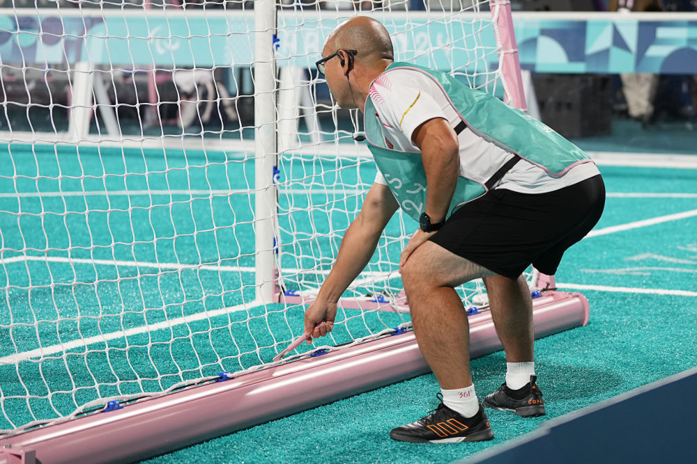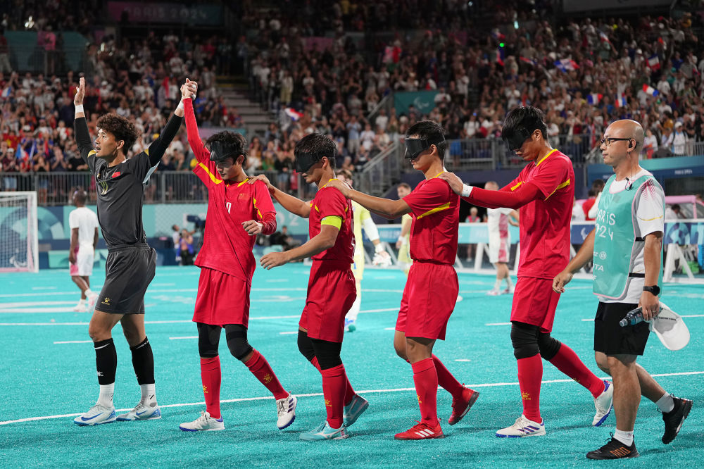 這是9月1日拍攝的巴黎殘奧會(huì)盲人足球比賽現(xiàn)場(chǎng)。新華社記者 熊琦 攝 1日晚,巴黎殘奧會(huì)盲人足球小組賽首輪,進(jìn)攻端占優(yōu)的中國(guó)隊(duì)0:1不敵東道主法國(guó)隊(duì)。此役,35歲老將俞裕錟替補(bǔ)出戰(zhàn),這是他第四次參加殘奧會(huì)?!拔覀兇虺隽饲蜿?duì)的風(fēng)格,但還需要在進(jìn)攻端提升把握機(jī)會(huì)的能力,爭(zhēng)取更多的進(jìn)球?!庇嵩eU說(shuō),“輸了沒(méi)關(guān)系,下一場(chǎng),我們?cè)賮?lái)!” 沒(méi)有華麗的踩單車(chē)過(guò)人,沒(méi)有炫酷的驚天倒鉤……除兩隊(duì)門(mén)將外,八名球員戴著黑色眼罩,在一次次奔跑、沖撞、摔倒、起身的動(dòng)作中循環(huán)往復(fù);比賽中,為不影響運(yùn)動(dòng)員發(fā)揮,現(xiàn)場(chǎng)觀眾只有在進(jìn)球之后才能歡呼喝彩。