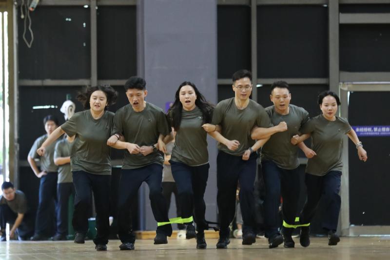 在隨后進行的趣味運動賽中,各支隊伍盡展所能,賽出屬于輕紡人的青春風(fēng)采。激烈的“力拔山河”多向拔河比賽,各隊隊員緊握繩索,腳跟扎地,在齊聲吶喊中爆發(fā)出驚人的力量,場面緊張而激烈;歡快的“齊頭并進”項目中,參賽選手綁腿搭肩同行,口中喊著整齊的口號,步伐協(xié)調(diào)地向著終點沖刺,如同親密無間的戰(zhàn)友;巧妙的“凝心聚力”背夾球環(huán)節(jié)中,隊員們背靠背,心連心,夾著氣球快速又小心地前進,氣球的每一次微晃都牽動著全場觀眾的心;充滿挑戰(zhàn)的“共渡難關(guān)”接力賽中,參賽隊伍爭分奪秒、心心相連、共渡難關(guān),巨大的“車輪”憑借團隊協(xié)作的力量在賽道上飛速滾動,仿佛破浪前行的巨輪,朝著勝利的彼岸全速前進。趣味運動賽的最后,各參賽隊伍代表共同拼出匯聚著全體參賽企業(yè)圖形徽標(biāo)的大拼圖并合影,象征著全體輕紡人團結(jié)一心、共同奮斗的堅定信念。經(jīng)過激烈而又充滿趣味的比拼,輕紡設(shè)計院最終獲得了趣味運動賽團體第一名,金皇環(huán)保和海峽融合分獲第二、第三名。