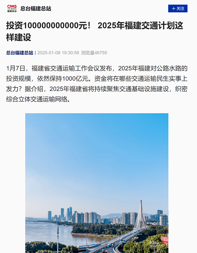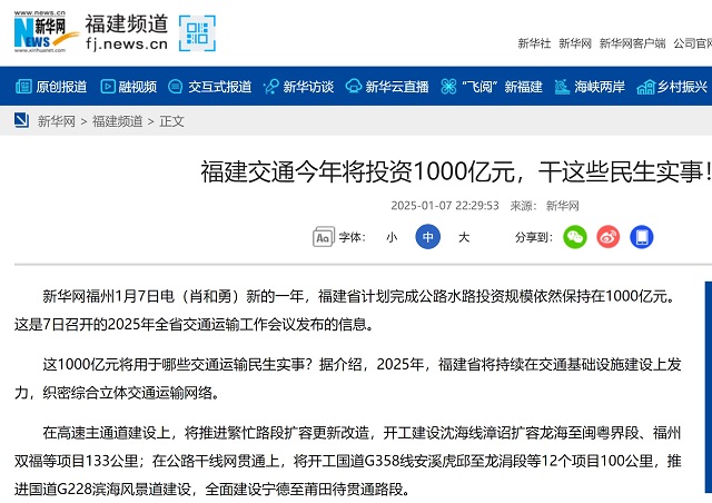 1月7日,2025年全省交通運輸工作會議召開?!哆B續(xù)5年超千億元:福建省交通投資保持高位運行》《福建交通今年計劃完成投資1000億元》在新華網(wǎng)、人民日報、央視網(wǎng)、央廣網(wǎng)、學習強國、中國經(jīng)濟網(wǎng)、海峽網(wǎng)、福建日報、齊魯晚報等媒體報道。各大媒體全方位介紹省交通運輸廳在2024年為經(jīng)濟大盤筑牢發(fā)展硬支撐的成就,并聚焦我省2025年交通運輸工作計劃。 福建電視臺