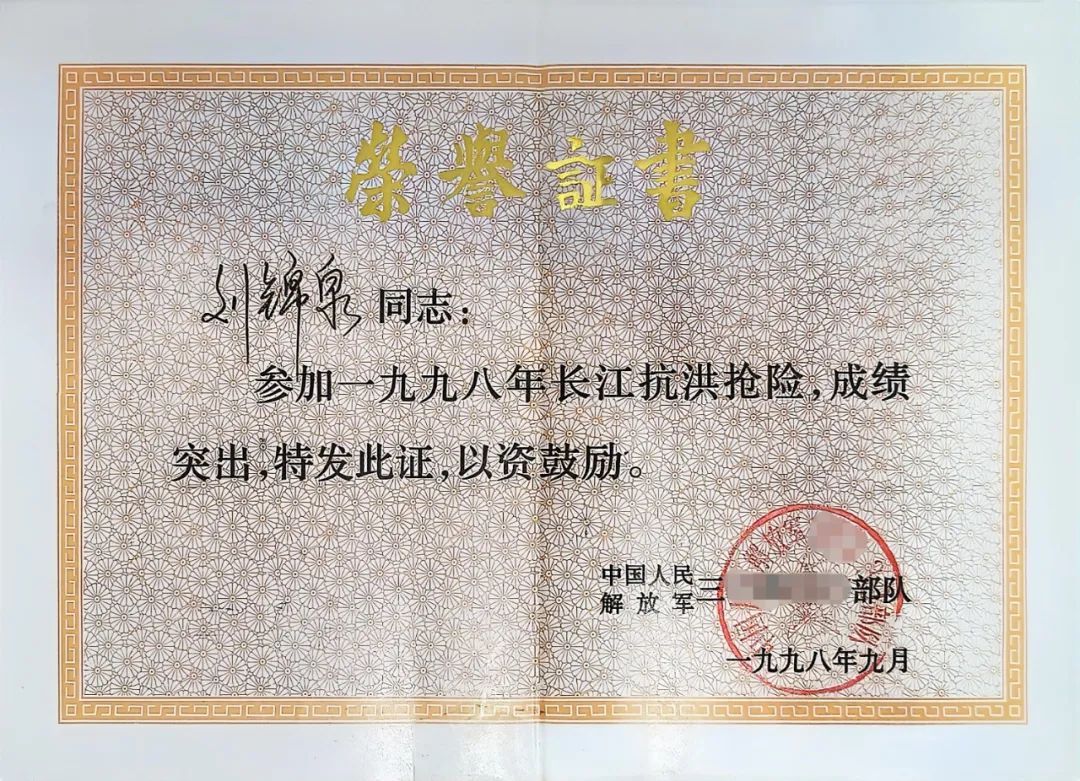 劉鳳彩轉(zhuǎn)業(yè)軍人證明書及四枚勛章 1997年冬,劉錦泉接過家族旗幟,參軍入伍。次年夏天,長(zhǎng)江告急,他隨部隊(duì)奔赴抗洪一線。齊腰深的洪水中,沙袋一袋接一袋地扛,手磨破了,腳泡白了,也從未退縮。那一刻,他腦海里回響的,正是爺爺?shù)脑挕?/p> 洪水退去,他胸前多了一本榮譽(yù)證書。更重要的是,他終于懂得了爺爺眼里的光——那是明知危險(xiǎn),也要為守護(hù)萬家燈火而向前的責(zé)任與勇氣。