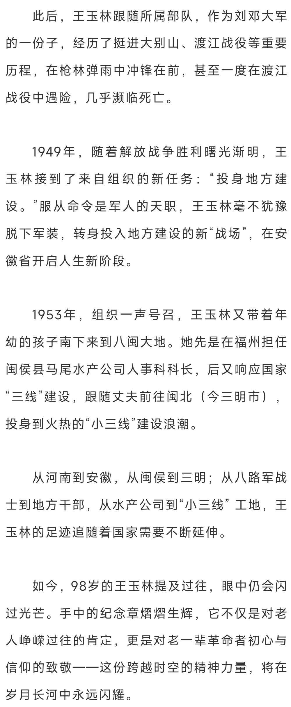 編者按: 為紀(jì)念中國人民抗日戰(zhàn)爭暨世界反法西斯戰(zhàn)爭勝利80周年,深入挖掘抗戰(zhàn)老兵事跡,傳承紅色基因,省退役軍人事務(wù)廳聯(lián)合各地市退役軍人事務(wù)部門開展走進(jìn)抗戰(zhàn)老兵家庭,重溫抗戰(zhàn)歷史系列活動(dòng)。廳官網(wǎng)官微開辟“致敬抗戰(zhàn)老兵”專欄對(duì)此進(jìn)行系列宣傳,今日推出《98歲八路軍女戰(zhàn)士王玉林,收到這枚金燦燦的紀(jì)念章》的故事。 日前,一枚承載著敬意的“中國人民抗日戰(zhàn)爭勝利80周年”紀(jì)念章,由閩侯縣農(nóng)業(yè)農(nóng)村局工作人員帶到三明市,送到了今年98歲高齡,曾在閩侯縣工作生活過的八路軍女戰(zhàn)士王玉林家中。 閩侯縣農(nóng)業(yè)農(nóng)村局工作人員為王玉林送上紀(jì)念章 當(dāng)天,王玉林坐在床邊,雙手雖因年歲微微顫抖,但仍穩(wěn)穩(wěn)接過紀(jì)念章,布滿皺紋的臉上漾起欣慰的笑容——這抹笑容里,藏著一段跨越80年的烽火記憶,也映照著一位老戰(zhàn)士對(duì)黨和國家的赤誠初心。 “中國人民抗日戰(zhàn)爭勝利80周年”紀(jì)念章 王玉林與其丈夫合影 |
