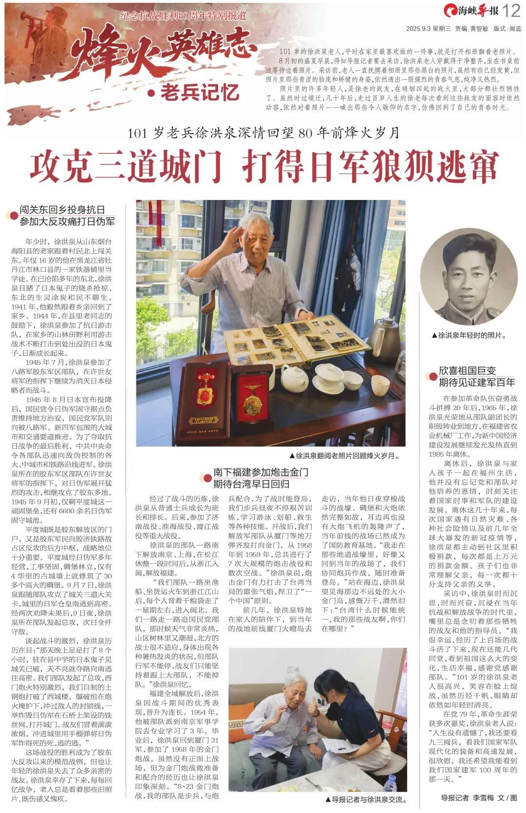編者按: 為紀(jì)念中國(guó)人民抗日戰(zhàn)爭(zhēng)暨世界反法西斯戰(zhàn)爭(zhēng)勝利80周年,深入挖掘抗戰(zhàn)老兵事跡,傳承紅色基因,省退役軍人事務(wù)廳聯(lián)合各地市退役軍人事務(wù)部門開展走進(jìn)抗戰(zhàn)老兵家庭,重溫抗戰(zhàn)歷史系列活動(dòng)。廳官網(wǎng)官微開辟“致敬抗戰(zhàn)老兵”專欄對(duì)此進(jìn)行系列宣傳,今日推出《百歲老兵徐洪泉:攻克三道城門 打得日軍狼狽逃竄》的故事。 徐洪泉翻閱老照片回顧烽火歲月 101歲的徐洪泉老人,平時(shí)在家里最喜歡做的一件事,就是打開相冊(cè)翻看老照片。 8月初的盛夏早晨,得知記者要去采訪,徐洪泉老人穿戴得干凈整齊,坐在書桌前邊等待邊看照片。采訪前,老人一直撫摸著相冊(cè)里那些黑白的照片,雖然有些已經(jīng)發(fā)黃,但照片里那些青澀的臉龐和矯健的身姿,依然透出一股強(qiáng)烈的青春氣息,純凈又熱烈。 照片里的許多年輕人,是徐老的戰(zhàn)友,在硝煙四起的戰(zhàn)火里,大部分都?jí)蚜覡奚?。雖然時(shí)過境遷,幾十年后,走過百歲人生的徐老每次看到這些戰(zhàn)友的面容時(shí)依然動(dòng)容,依然對(duì)著照片一一喊出那些令人敬仰的名字,仿佛回到了自己的青春時(shí)光。 闖關(guān)東回鄉(xiāng)投身抗日 參加大反攻痛打日偽軍 年少時(shí),徐洪泉從山東煙臺(tái)海陽縣的老家跟著村民北上闖關(guān)東。年僅16歲的他在黑龍江省牡丹江市林口縣的一家鐵器鋪里當(dāng)學(xué)徒。在已淪陷多年的東北,徐洪泉目睹了日本鬼子的燒殺搶掠、東北的生靈涂炭和民不聊生。1941年,他毅然跟著鄉(xiāng)親回到了家鄉(xiāng)。1944年,在縣里老同志的鼓勵(lì)下,徐洪泉參加了抗日游擊隊(duì),在家鄉(xiāng)的山林田野利用游擊戰(zhàn)術(shù)不斷打擊到處出沒的日本鬼子,日漸成長(zhǎng)起來。 1945年7月,徐洪泉參加了八路軍膠東軍區(qū)部隊(duì),在許世友將軍的指揮下繼續(xù)為消滅日本侵略者而戰(zhàn)斗。 1945年8月日本宣布投降后,國(guó)民黨令日偽軍固守?fù)?jù)點(diǎn)負(fù)責(zé)維持地方治安,國(guó)民黨軍隊(duì)則向被八路軍、新四軍包圍的大城市和交通要道推進(jìn)。為了奪取抗日戰(zhàn)爭(zhēng)的最后勝利,中共中央命令各部隊(duì)迅速向敵偽控制的各大、中城市和鐵路沿線進(jìn)軍。徐洪泉所在的膠東軍區(qū)部隊(duì)在許世友將軍的指揮下,對(duì)日偽軍展開猛烈的攻擊,相繼攻克了膠東多地。至1945年9月初,僅剩平度城這一頑固堡壘,還有6600余名日偽軍固守城池。 徐洪泉年輕時(shí)的照片 平度城既是膠東解放區(qū)的門戶,又是膠東軍民向膠濟(jì)鐵路敵占區(qū)反攻的后方中樞,戰(zhàn)略地位十分重要。平度城經(jīng)日偽軍多年經(jīng)營(yíng),工事堅(jiān)固,碉堡林立,僅有4華里的古城墻上就修筑了30多個(gè)高大的碉堡。9月7日,徐洪泉跟隨部隊(duì)攻克了城關(guān)三道大關(guān)卡,城里的日軍倉(cāng)皇南逃到高密。經(jīng)兩次勸降未果后,9日夜,徐洪泉所在部隊(duì)發(fā)起總攻,次日全殲守?cái)场?/p> 談起戰(zhàn)斗的激烈,徐洪泉?dú)v歷在目:“那天晚上足足打了8個(gè)小時(shí),駐在縣中學(xué)的日本鬼子見城關(guān)已破,天不亮就奪路向南逃往高密。我們部隊(duì)發(fā)起了總攻,西門炮火特別激烈,我們自制的土鋼炮打破了西城樓。爆破組在炮火掩護(hù)下,沖過敵人的封鎖線,一舉炸毀日偽軍在石橋上架設(shè)的鐵絲網(wǎng),打開城門。戰(zhàn)友們冒著滾滾濃煙,沖進(jìn)城里用手榴彈炸得日偽軍死傷慘重,四處逃竄?!?/p> 這場(chǎng)戰(zhàn)役的勝利成為了膠東大反攻以來的模范戰(zhàn)例,但也讓年輕的徐洪泉失去了眾多親密的戰(zhàn)友。徐洪泉幸存了下來,每每回憶戰(zhàn)爭(zhēng),老人總是看著那些舊照片,既傷感又愧疚。 南下福建參加炮擊金門 期待臺(tái)灣早日回歸 經(jīng)過了戰(zhàn)斗的歷練,徐洪泉從普通士兵成長(zhǎng)為班長(zhǎng)和排長(zhǎng)。后來,參加了濟(jì)南戰(zhàn)役、淮海戰(zhàn)役、渡江戰(zhàn)役等重大戰(zhàn)役。 徐洪泉的部隊(duì)一路南下解放南京、上海,在松江休整一段時(shí)間后,從浙江入閩,解放福建。 “我們部隊(duì)一路乘漁船、乘貨運(yùn)火車到浙江江山后,每個(gè)人背著干糧袋走了一星期左右,進(jìn)入閩北。我們一路走一路追國(guó)民黨部隊(duì),那時(shí)候天氣非常炎熱,山區(qū)樹林里又潮濕,北方的戰(zhàn)士很不適應(yīng),身體出現(xiàn)各種暑熱發(fā)炎的狀況,但部隊(duì)行軍不能停,戰(zhàn)友們只能堅(jiān)持著跟上大部隊(duì),不能掉隊(duì)?!毙旌槿貞洝?/p> 福建全域解放后,徐洪泉因作戰(zhàn)英勇、表現(xiàn)突出,晉升為連長(zhǎng)。1954年,他被選派至南京軍事學(xué)院進(jìn)行了為期三年的專業(yè)學(xué)習(xí)。畢業(yè)后,徐洪泉回到廈門31軍,參加了1958年的金門炮戰(zhàn)。雖然沒有正面上戰(zhàn)場(chǎng),但為金門炮戰(zhàn)做準(zhǔn)備和配合的經(jīng)歷也讓徐洪泉印象深刻?!?#39;8·23金門炮戰(zhàn)',我的部隊(duì)是步兵,與炮兵配合,為了戰(zhàn)時(shí)能登島,我們步兵晝夜不停艱苦訓(xùn)練,學(xué)習(xí)游泳、劃船、救生等各種技能。開戰(zhàn)后,我們解放軍部隊(duì)從廈門等地萬彈齊發(fā)打向金門,從1958年到1959年,總共進(jìn)行了7次大規(guī)模的炮擊戰(zh