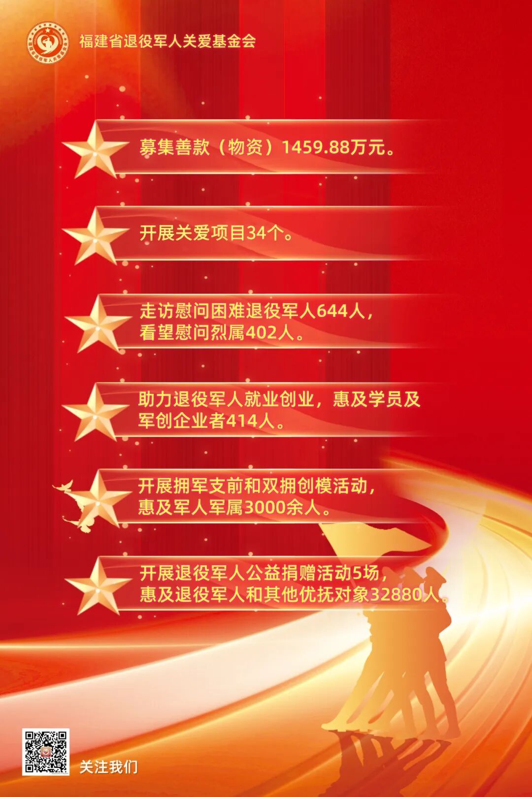 一個個關(guān)愛項目落地見效,一場場關(guān)愛活動成功舉行,一次次慈善捐贈愛心行動,一張張溫情瞬間映入眼前,見證了關(guān)愛行動溫暖時刻,匯聚著社會各界的涓涓愛心。 愛始于心,善始于行。2023年9月20日,在省退役軍人事務(wù)廳黨組精心指導(dǎo)下,福建省退役軍人關(guān)愛基金會正式成立,2年來,基金會始終不忘初心使命,凝聚愛心力量,傳遞黨和政府的關(guān)懷,傳送企業(yè)和社會組織的愛心,讓退役軍人和其他優(yōu)撫對象獲得感、榮譽感、幸福感成色更足,有力有效推動我省退役軍人服務(wù)保障工作高質(zhì)量發(fā)展。 基金會成立以來,始終秉持“服務(wù)宗旨、尊崇關(guān)愛”的理念,致力于搭建政府與退役軍人之間的橋梁,在解困幫扶、助力就業(yè)創(chuàng)業(yè)、擁軍支前、思政引領(lǐng)、宣傳研討等項目方面探索實踐,著力解決退役軍人和其他優(yōu)撫對象急難愁盼問題。