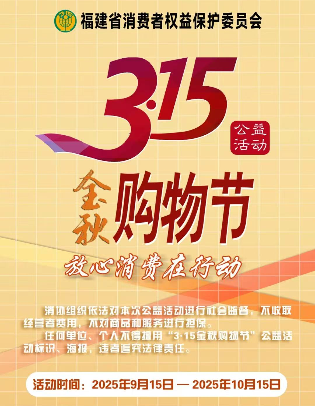 為大力提振消費、優(yōu)化消費環(huán)境,為期一個月的2025年福建省“3?15金秋購物節(jié)”公益活動于10月15日圓滿落幕。本次活動累計惠及消費者1570.34萬人次,有效激活了福建消費市場的內生動力,實現(xiàn)了消費提振與消費者權益保障的雙向共贏。