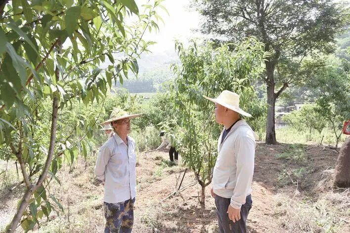 “這邊的草得鋤一下,然后往中間堆?!薄澳銈?nèi)藟虿粔?,不夠我下午再多喊幾個(gè)一起鋤?!薄?,走進(jìn)三明市沙縣區(qū)虬江街道長紅村,一個(gè)皮膚黝黑的男人正帶領(lǐng)村民們在桃園做除草管護(hù),他就是長紅村黨支部書記、村委會主任、退役軍人——肖盛榮。