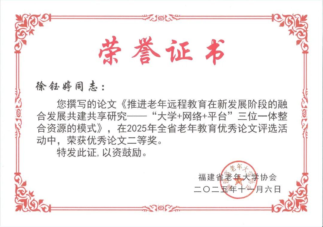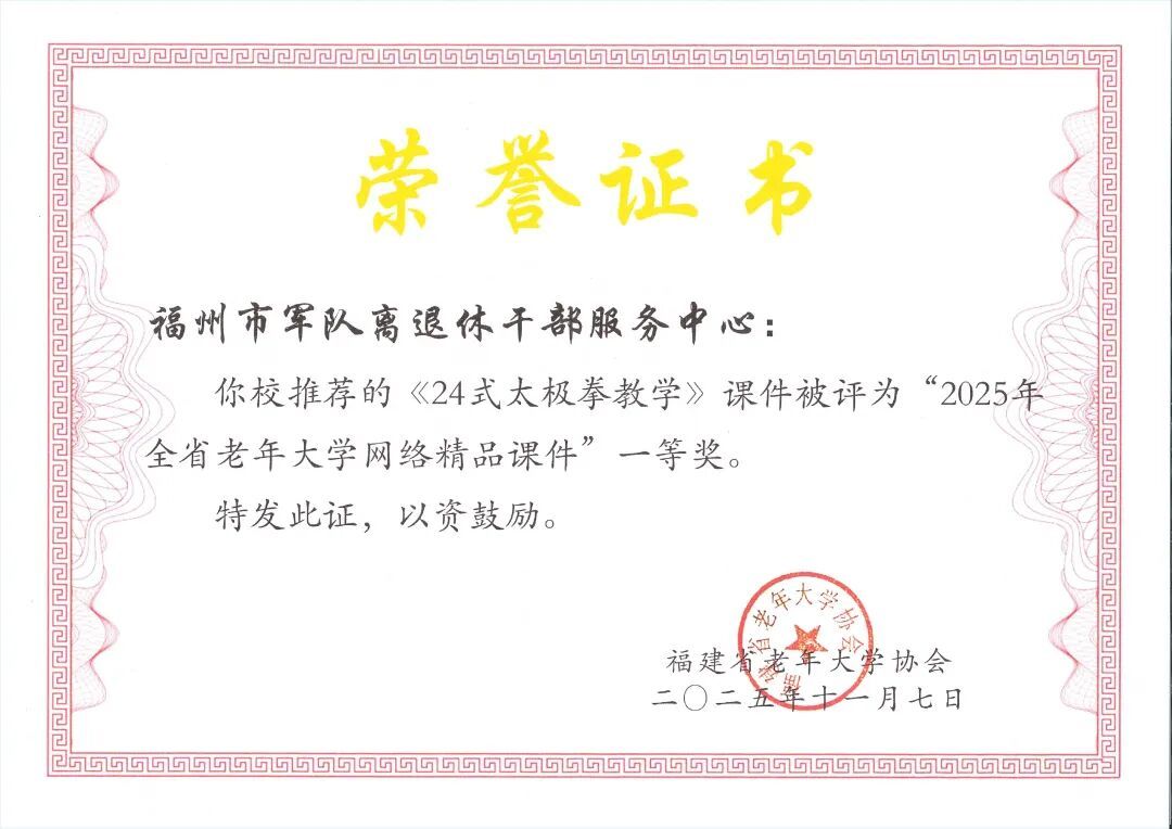 近日,全省老年教育工作會(huì)議在南平召開,表彰2025年全省老年教育優(yōu)秀成果。福州市軍休老年大學(xué)選送的《24式太極拳教學(xué)》榮獲“2025年全省老年大學(xué)網(wǎng)絡(luò)精品課件”一等獎(jiǎng);軍休老年大學(xué)工作人員徐鈺婷撰寫的論文《推進(jìn)老年遠(yuǎn)程教育在新發(fā)展階段的融合發(fā)展共建共享研究——“大學(xué)+網(wǎng)絡(luò)+平臺(tái)”三位一體整合資源的模式》獲評“2025年全省老年教育優(yōu)秀論文”二等獎(jiǎng)。