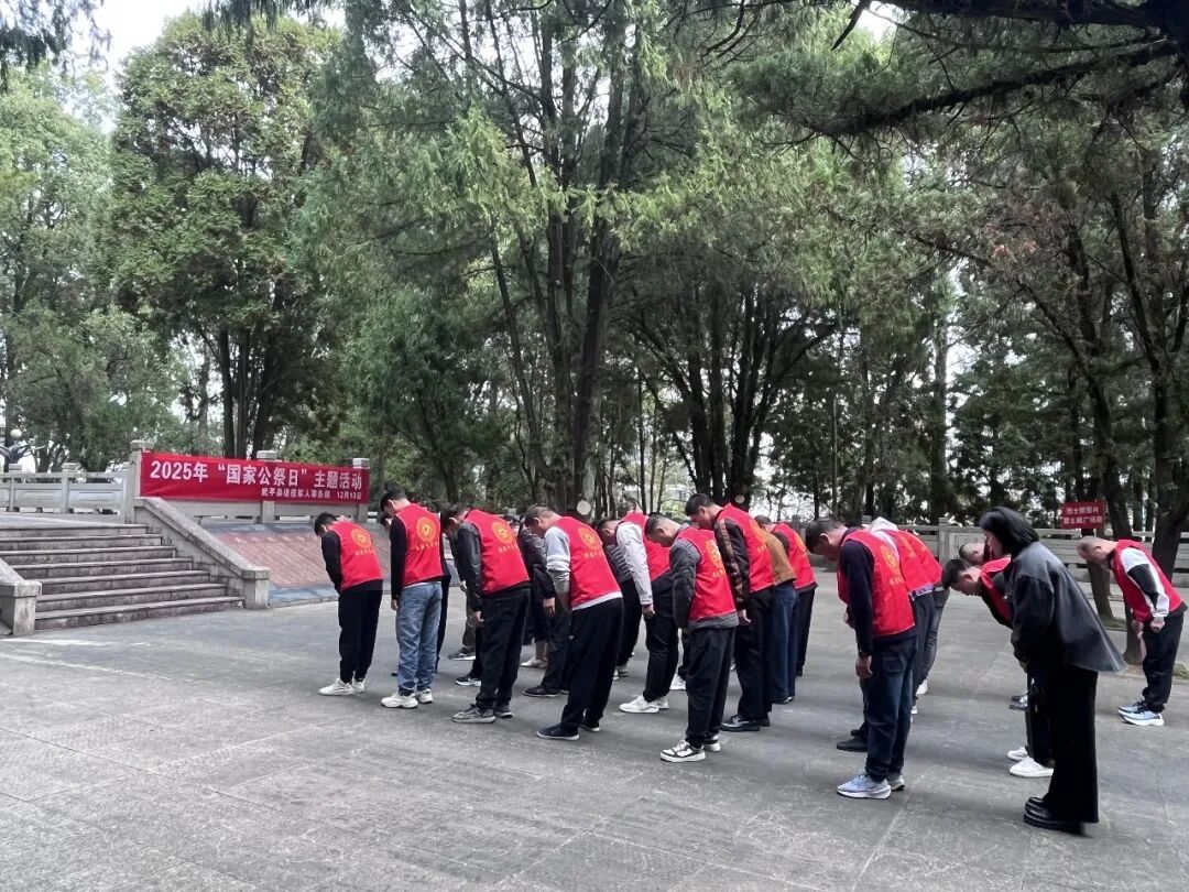 儀式結(jié)束后,全體人員前往烈士陵園,瞻仰默哀并緩步繞行紀(jì)念碑一周,接受革命傳統(tǒng)教育,通過實(shí)地感受、參觀學(xué)習(xí),深切感受革命先烈的不朽精神,在緬懷與追思中進(jìn)一步堅(jiān)定傳承紅色基因、守護(hù)和平未來的信念與決心。 “當(dāng)國(guó)旗經(jīng)過我手中時(shí),內(nèi)心無比激動(dòng)。和平來之不易,我們新時(shí)代少年定將悲痛化為力量,勤奮學(xué)習(xí)、強(qiáng)健體魄,傳承愛國(guó)精神,守護(hù)今日和平?!睂W(xué)生代表林江樾表示。 黨員代表傅興華說:“一名黨員就是一面旗幟,觸摸著胸前的黨員徽章,更感責(zé)任重大。我們將牢記歷史,在工作中勇挑重?fù)?dān),在生活中傳遞正能量,把對(duì)歷史的銘記轉(zhuǎn)化為建設(shè)家園、守護(hù)和平的實(shí)際行動(dòng)。” 12月13日,龍巖市武平縣退役軍人事務(wù)局聯(lián)合縣司法局組織職工干部和社區(qū)矯正對(duì)象前往縣革命烈士陵園開展國(guó)家公祭日主題活動(dòng),以肅穆的儀式緬懷英烈,以實(shí)際行動(dòng)銘記歷史,以紅色教育淬煉思想。