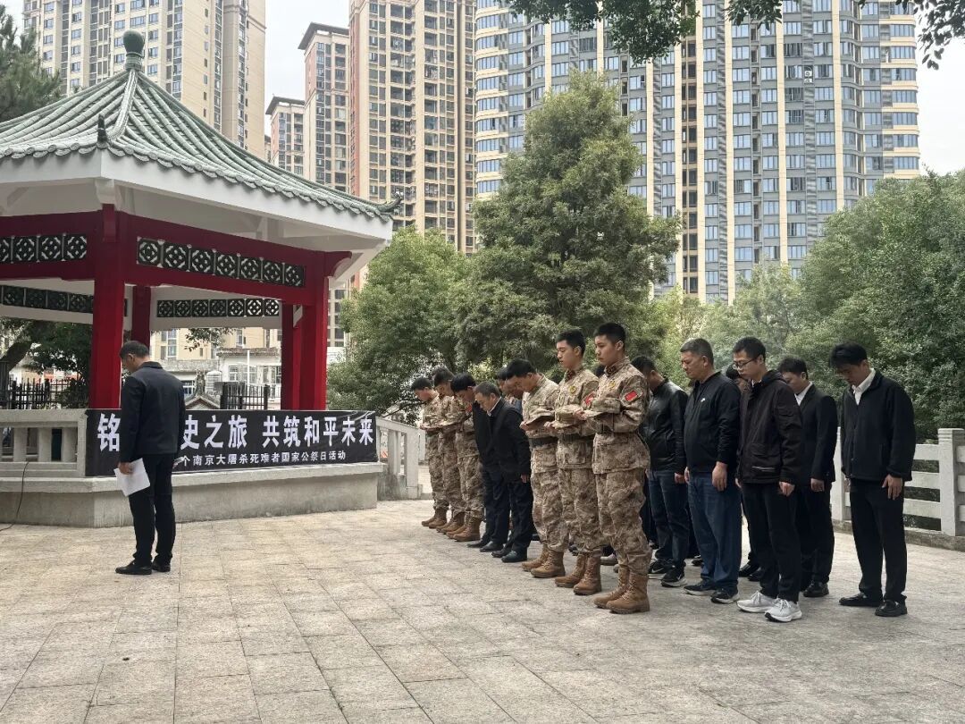 寒冬肅立,警鐘長(zhǎng)鳴?;顒?dòng)在主持人的致辭中拉開帷幕,致辭既回望了南京大屠殺中三十萬同胞遇難的沉痛歷史,也闡明了國(guó)家公祭日以國(guó)家名義緬懷逝者、告慰先烈的深刻意義,號(hào)召在場(chǎng)人員銘記歷史、珍愛和平、開創(chuàng)未來。隨后,全體人員向南京大屠殺遇難同胞及為民族獨(dú)立和人民解放犧牲的先烈致以深切哀悼,并集體肅立默哀一分鐘,以此寄托對(duì)遇難同胞和革命先烈的無盡哀思。