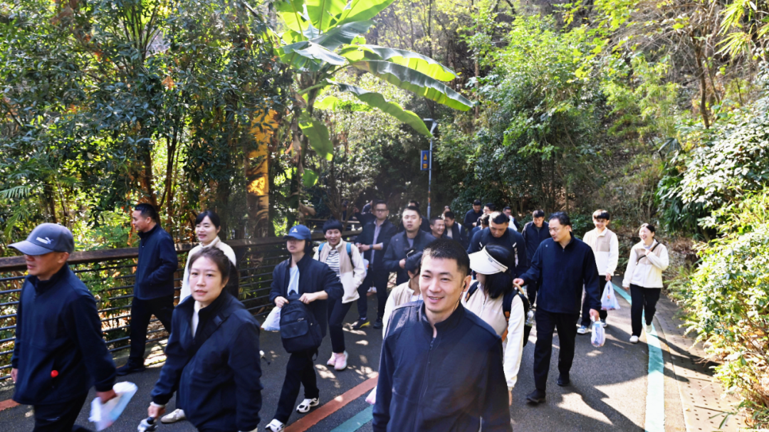 當(dāng)天10時(shí)15分,健步走活動(dòng)正式開始。全體人員一路沿著蜿蜒的登山步道穩(wěn)步前行,一路上,大家精神飽滿,臉上洋溢著自信的笑容。有的同志步伐輕快,一路領(lǐng)先,展現(xiàn)出勇爭第一的決心;有的同志則相互鼓勵(lì),攜手共進(jìn),展現(xiàn)了積極向上的精神風(fēng)貌。途經(jīng)茉莉園、祈福臺(tái)、不見橋等景觀節(jié)點(diǎn),大家紛紛駐足欣賞,感受著大自然的美麗與寧靜。最終,全體人員順利抵達(dá)芙蓉園終點(diǎn)。