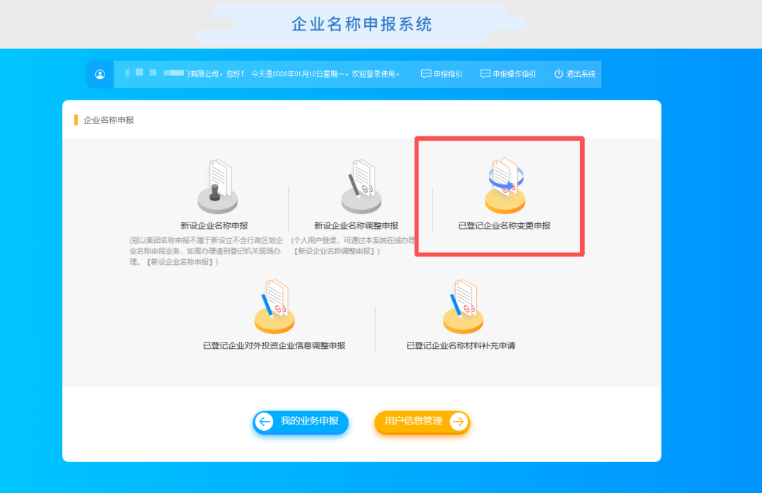 3.登錄成功后,在頁面選擇“已登記企業(yè)名稱變更申報”模塊。