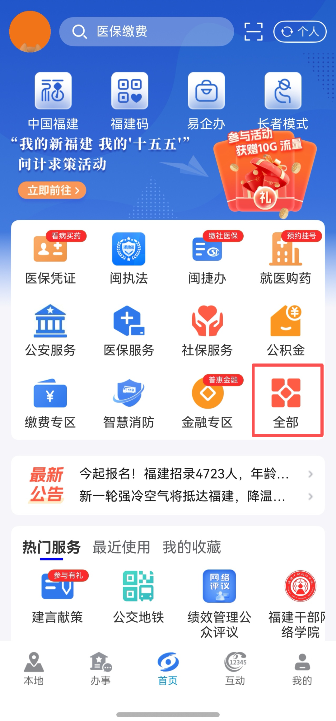 ? 求職者(退役軍人及軍屬)報(bào)名方式 1.打開閩政通App,點(diǎn)擊“全部”;