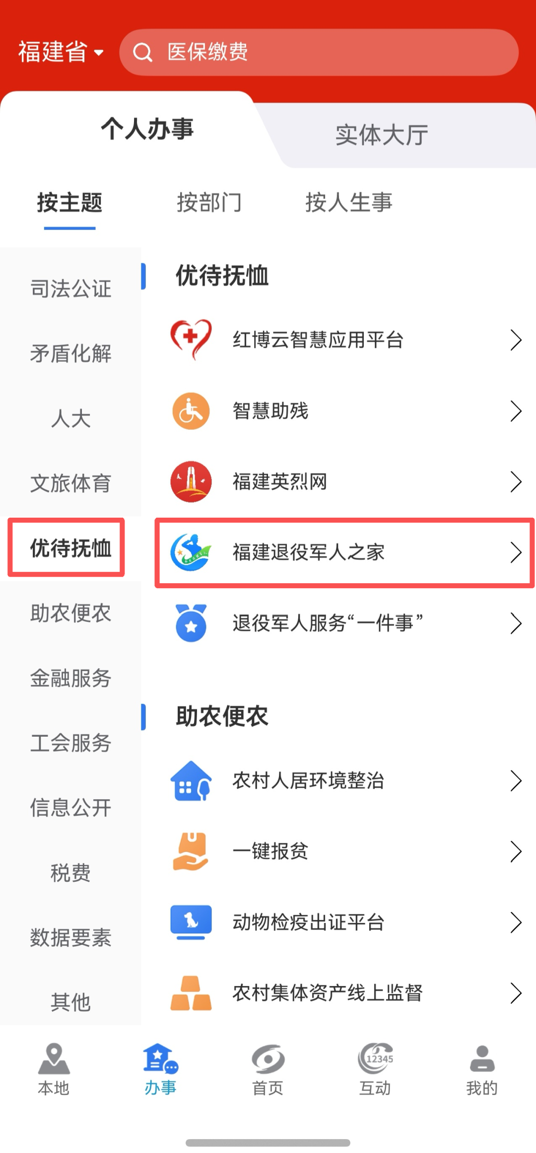 2.在“個(gè)人辦事”中選擇“優(yōu)待撫恤”,選擇“福建退役軍人之家”進(jìn)入退役軍人專區(qū);