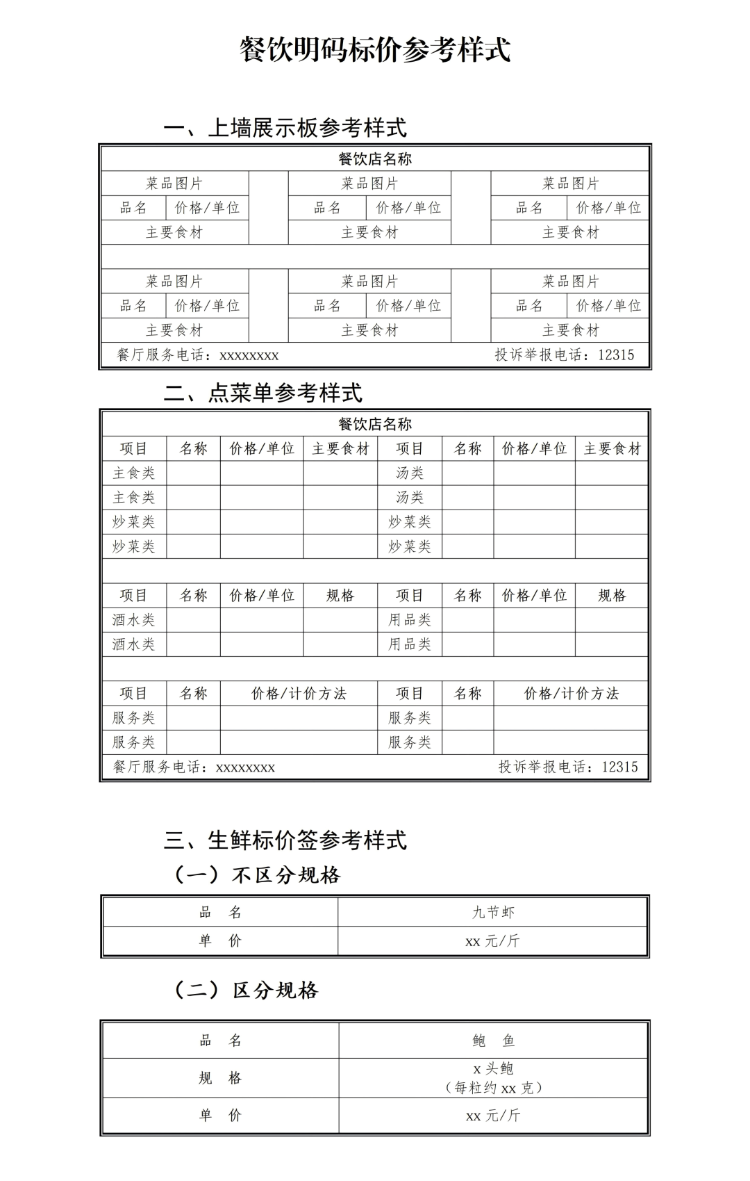 根據(jù)《中華人民共和國(guó)價(jià)格法》《明碼標(biāo)價(jià)和禁止價(jià)格欺詐規(guī)定》《中華人民共和國(guó)消費(fèi)者權(quán)益保護(hù)法》《餐飲業(yè)促進(jìn)和經(jīng)營(yíng)管理辦法》等法律法規(guī)和國(guó)家有關(guān)規(guī)定梳理形成本指引,供各餐飲經(jīng)營(yíng)者參考使用。 餐飲收費(fèi)“十標(biāo)清”指引 一、收費(fèi)標(biāo)準(zhǔn)要標(biāo)清。 餐飲經(jīng)營(yíng)者應(yīng)通過(guò)價(jià)目表、點(diǎn)菜單、展示板或點(diǎn)菜小程序等方式,清晰完整地公示所有盤(pán)菜、套餐、主食等菜品和酒水、紙巾等商品用品以及加工、打包、外送等服務(wù)的收費(fèi)單價(jià)和計(jì)價(jià)單位。 二、主要食材要標(biāo)清。 餐飲經(jīng)營(yíng)者應(yīng)在經(jīng)營(yíng)場(chǎng)所醒目位置,對(duì)各式菜品的主要食材予以明確標(biāo)示。如“砂鍋牛腩(主要食材:牛腩、蘿卜)”。 三、時(shí)令菜價(jià)要標(biāo)清。 餐飲經(jīng)營(yíng)者應(yīng)當(dāng)及時(shí)更新時(shí)令菜品價(jià)格信息,并在大廳、點(diǎn)菜區(qū)等顯著位置通過(guò)價(jià)目表、電子屏等方式公示海鮮、蔬菜、瓜果等時(shí)令菜品的最新價(jià)格。 四、食材屬性要標(biāo)清。 對(duì)價(jià)格較高或容易引發(fā)爭(zhēng)議的特殊食材,餐飲經(jīng)營(yíng)者應(yīng)當(dāng)特別備注其產(chǎn)地、養(yǎng)殖方式、品級(jí)等屬性。如標(biāo)注“甲魚(yú)(野生)”“大閘蟹(產(chǎn)地:陽(yáng)澄湖)”。 五、加工費(fèi)用要標(biāo)清。 如需對(duì)生鮮菜品加收烹飪加工費(fèi)的,餐飲經(jīng)營(yíng)者應(yīng)分別標(biāo)明生鮮食材價(jià)格和加工費(fèi)用。如“小青龍XX元/斤,避風(fēng)塘風(fēng)味加工費(fèi)XX元/份”。 六、額外費(fèi)用要標(biāo)清。 在菜金之外,如需加收服務(wù)費(fèi)、茶水費(fèi)以及一次性消毒餐具、紙巾等費(fèi)用的,餐飲經(jīng)營(yíng)者應(yīng)在價(jià)目表、點(diǎn)菜單等醒目位置逐一標(biāo)明收費(fèi)標(biāo)準(zhǔn),并在消費(fèi)者點(diǎn)餐時(shí)主動(dòng)告知。 七、套餐內(nèi)容要標(biāo)清。 提供年夜飯、旅游團(tuán)餐等套餐的,餐飲經(jīng)營(yíng)者應(yīng)標(biāo)明套餐價(jià)格,并逐一列明套餐所含的菜品、商品、用品的名稱、份量、適用人數(shù)及相關(guān)服務(wù)內(nèi)容,同時(shí)標(biāo)明是否加收服務(wù)費(fèi)、茶水費(fèi)等其他收費(fèi)。 八、外賣價(jià)格要標(biāo)清。 通過(guò)網(wǎng)絡(luò)平臺(tái)提供外賣服務(wù)的,餐飲經(jīng)營(yíng)者應(yīng)在平臺(tái)頁(yè)面清晰公示菜品、飲品、商品、用品的價(jià)格、份量,以及打包、配送等服務(wù)收費(fèi)標(biāo)準(zhǔn)。 九、價(jià)格優(yōu)惠要標(biāo)清。 開(kāi)展降價(jià)、打折、團(tuán)購(gòu)套餐等促銷活動(dòng)時(shí),餐飲經(jīng)營(yíng)者應(yīng)在經(jīng)營(yíng)場(chǎng)所或網(wǎng)絡(luò)平臺(tái)醒目位置標(biāo)明優(yōu)惠菜品、優(yōu)惠價(jià)格、優(yōu)惠期限、優(yōu)惠條件、使用限制等詳細(xì)信息。 十、服務(wù)熱線要標(biāo)清。 餐飲經(jīng)營(yíng)者應(yīng)當(dāng)在經(jīng)營(yíng)場(chǎng)所顯著位置標(biāo)明服務(wù)電話和投訴舉報(bào)渠道,方便顧客及時(shí)反映價(jià)格、服務(wù)等相關(guān)訴求。 餐飲收費(fèi)“十不得”指引 一、不得使用品名、價(jià)格、計(jì)價(jià)單位標(biāo)示不清的價(jià)目表、點(diǎn)菜單,或使用“時(shí)價(jià)”“面議”等模糊表述規(guī)避明碼標(biāo)價(jià)義務(wù)。 二、不得在公示的菜品和酒水等商品價(jià)格及服務(wù)收費(fèi)標(biāo)價(jià)之外,加價(jià)收取菜金、出售商品或者提供服務(wù)。 三、不得收取任何未予標(biāo)明的服務(wù)費(fèi)、茶水費(fèi)、廚余垃圾處理費(fèi)以及一次性消毒餐具、紙巾等各類費(fèi)用。 四、不得通過(guò)不標(biāo)示、模糊標(biāo)示或以細(xì)小字體、隱蔽位置等顯著弱化方式,標(biāo)示對(duì)消費(fèi)者不利的價(jià)格條件。 五、不得使用具有欺騙性、誤導(dǎo)性的菜品圖片、視頻等媒介標(biāo)示價(jià)格相關(guān)信息,誘騙消費(fèi)者進(jìn)行消費(fèi)。 六、不得采取“陰陽(yáng)菜單”“兩套價(jià)格”“低標(biāo)高結(jié)”等不正當(dāng)價(jià)格手段欺詐消費(fèi)者。 七、不得設(shè)定任何形式的最低消費(fèi)金額,包括通過(guò)包間費(fèi)、指定套餐等變相方式設(shè)定最低消費(fèi)。 八、不得在消費(fèi)者核銷團(tuán)購(gòu)優(yōu)惠券等憑證時(shí),臨時(shí)增設(shè)使用條件或限制使用范圍,變相提高消費(fèi)價(jià)格。 九、不得在未經(jīng)消費(fèi)者同意的情況下,擅自降低已承諾提供的菜品質(zhì)量或服務(wù)標(biāo)準(zhǔn)。 十、不得在節(jié)假日、旅游旺季等重要時(shí)段,利用市場(chǎng)供需緊張狀況,坐地起價(jià)、跟風(fēng)漲價(jià)、哄抬價(jià)格,擾亂市場(chǎng)秩序。