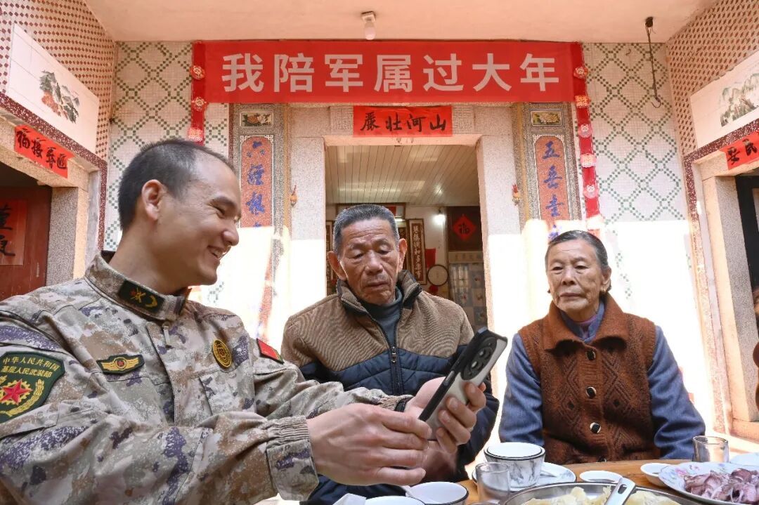 午餐時(shí)分,眾人圍坐一堂。劉福水非常高興,他說,孫子入伍后,家里過年略顯冷清,“今年不一樣了,這么多人來(lái)到家里慰問。當(dāng)軍屬,很光榮!”“你們守護(hù)國(guó)家,我們照顧好家鄉(xiāng)!”正在此時(shí),鎮(zhèn)武裝部部長(zhǎng)吳毅強(qiáng)撥通了在南部戰(zhàn)區(qū)某部服役劉星燁的電話,一句樸素的話,道出了真摯的軍民情。