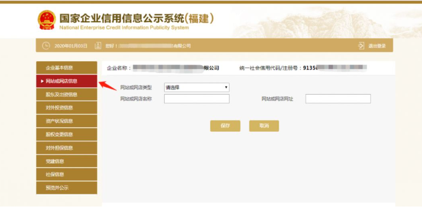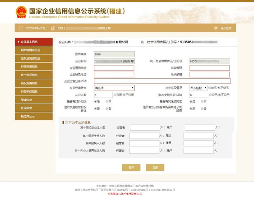 第五步:填寫基本信息。需要填報的通信地址、郵政編碼、聯(lián)系電話、電子郵箱、存續(xù)狀態(tài)、網(wǎng)址、網(wǎng)站信息均為報送時的信息,其余信息為所報告年度12月31日的信息。如果有網(wǎng)站、對外擔保,就點“是否有網(wǎng)站或網(wǎng)店”后面的“是”字前的圓點,如果沒有網(wǎng)站、對外擔保就點“否”字前的圓點。填寫完后點“保存”。