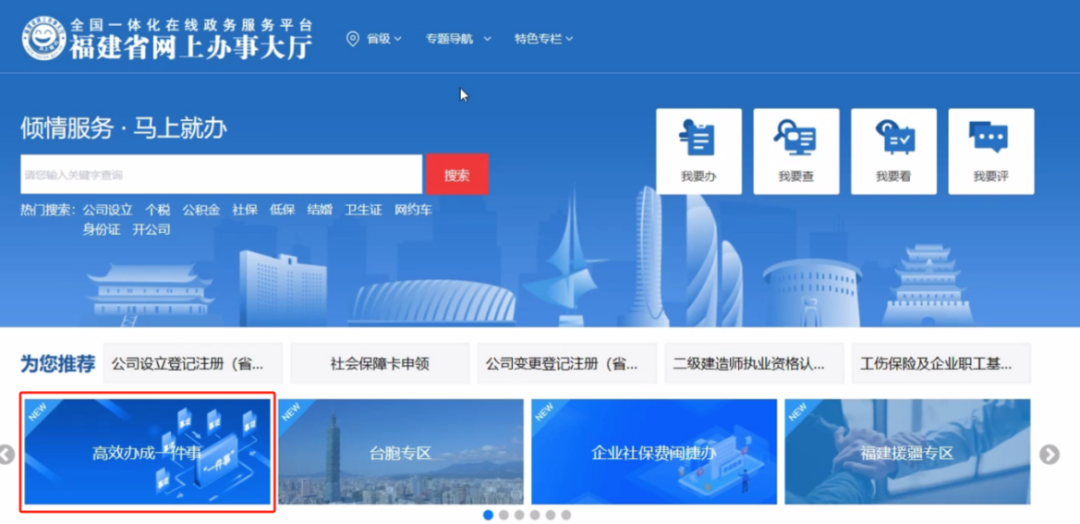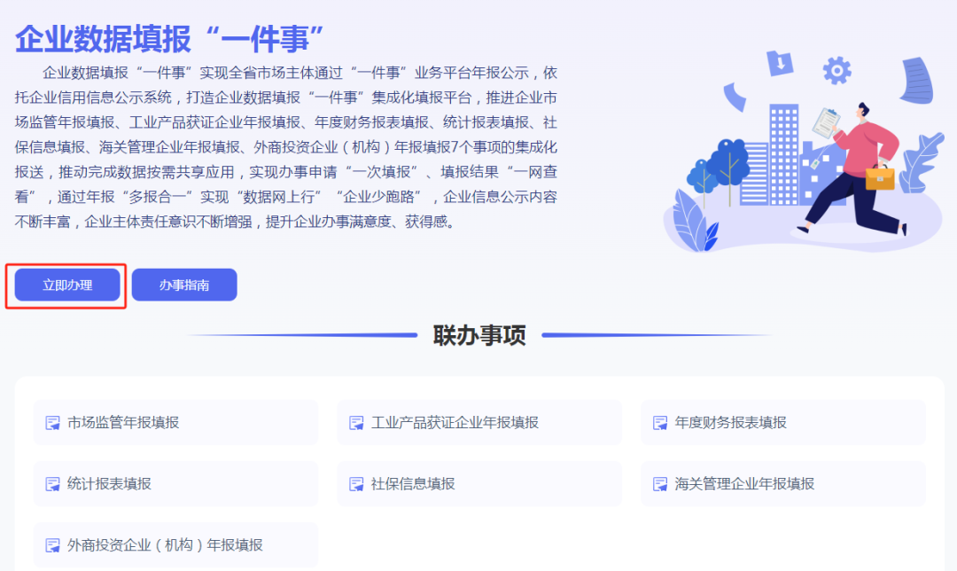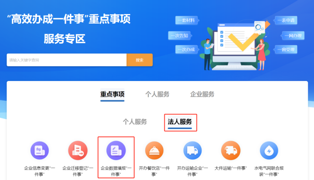 或通過福建省網(wǎng)上辦事大廳 (https://zwfw.fujian.gov.cn/)找到高效辦成一件事專區(qū),在服務專區(qū)的法人服務,找到企業(yè)數(shù)據(jù)填報一件事,點擊立即辦理。