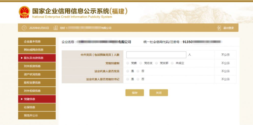 第十二步:填寫黨建信息。黨建信息為不公示信息,主要采集私營企業(yè)黨組織的建立情況,但屬于抽查范圍,請注意如實填寫。其中,中共黨員(包括預備黨員)人數(shù),為截至年度報告年份12月31日的人數(shù)。如企業(yè)暫無黨員,填寫“0”人后點擊保存即可。