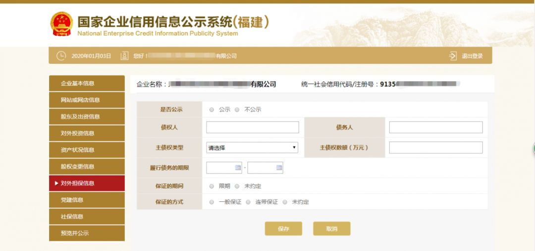 根據(jù)審計報告、資產(chǎn)負債等如實填寫企業(yè)資產(chǎn)狀況,若選擇“公示”則對外公示,若選擇“不公示”,則公示查看該指標不對外公示,顯示“不公示”。 此處填寫時應注意:1) 資產(chǎn)總額=所有者權(quán)益合計+負債總額。2) 負債總額不可為負值。3) 營業(yè)總收入>=主營業(yè)務收入。4) 利潤總額>凈利潤。5)系統(tǒng)設(shè)置數(shù)額單位是“萬元”,僅填寫數(shù)字即可,并注意核對數(shù)據(jù)準確性。點擊“保存”按鈕,進入下一部分內(nèi)容的填寫頁面。 第十一步:填寫對外擔保信息。點擊左邊的對外擔保信息,根據(jù)實際情況進行添加之后點擊“保存”。如無對外擔保情況的則無需填寫此項信息。